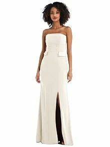A new classic. Strapless crepe tuxedo maxi dress with lux charmeuse details. Modified trumpet skirt with front slit.