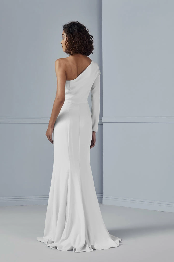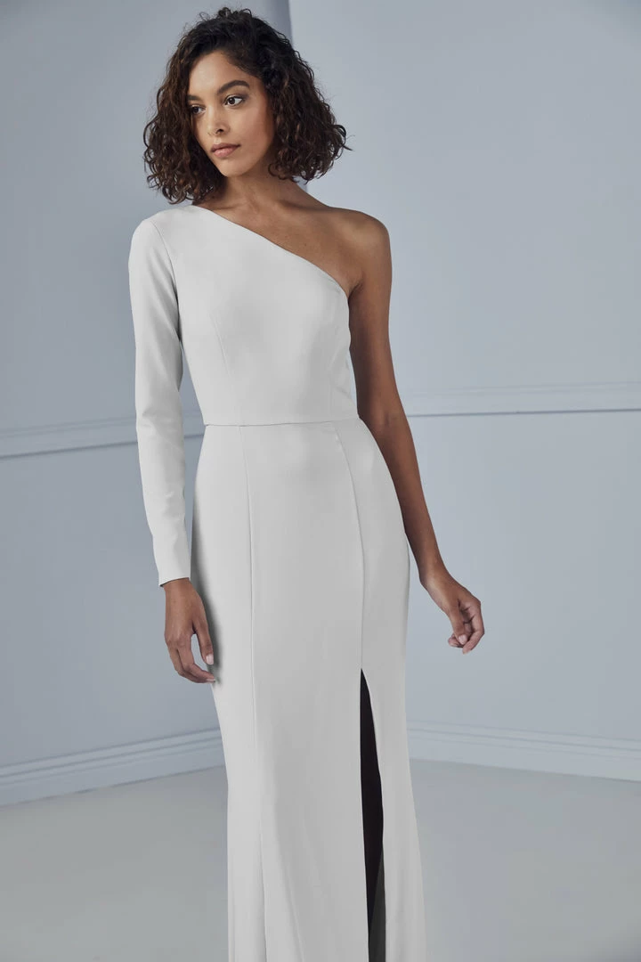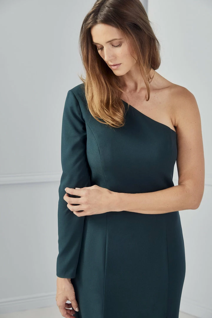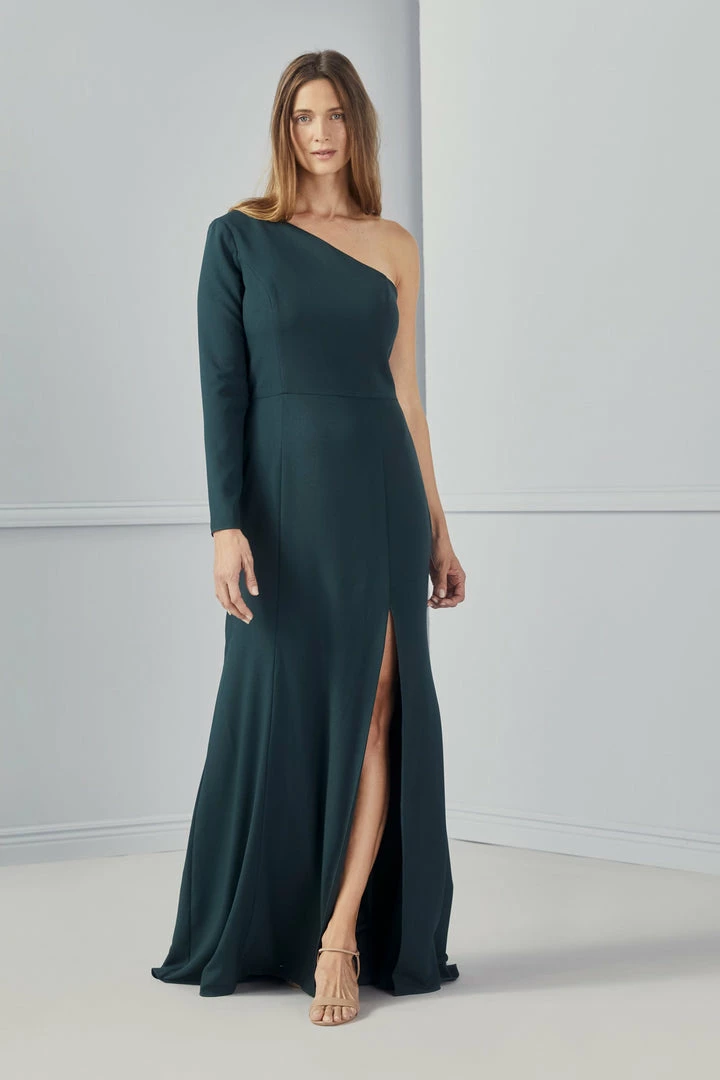 Asymmetrical one-sleeve dress with slit in Crepe.