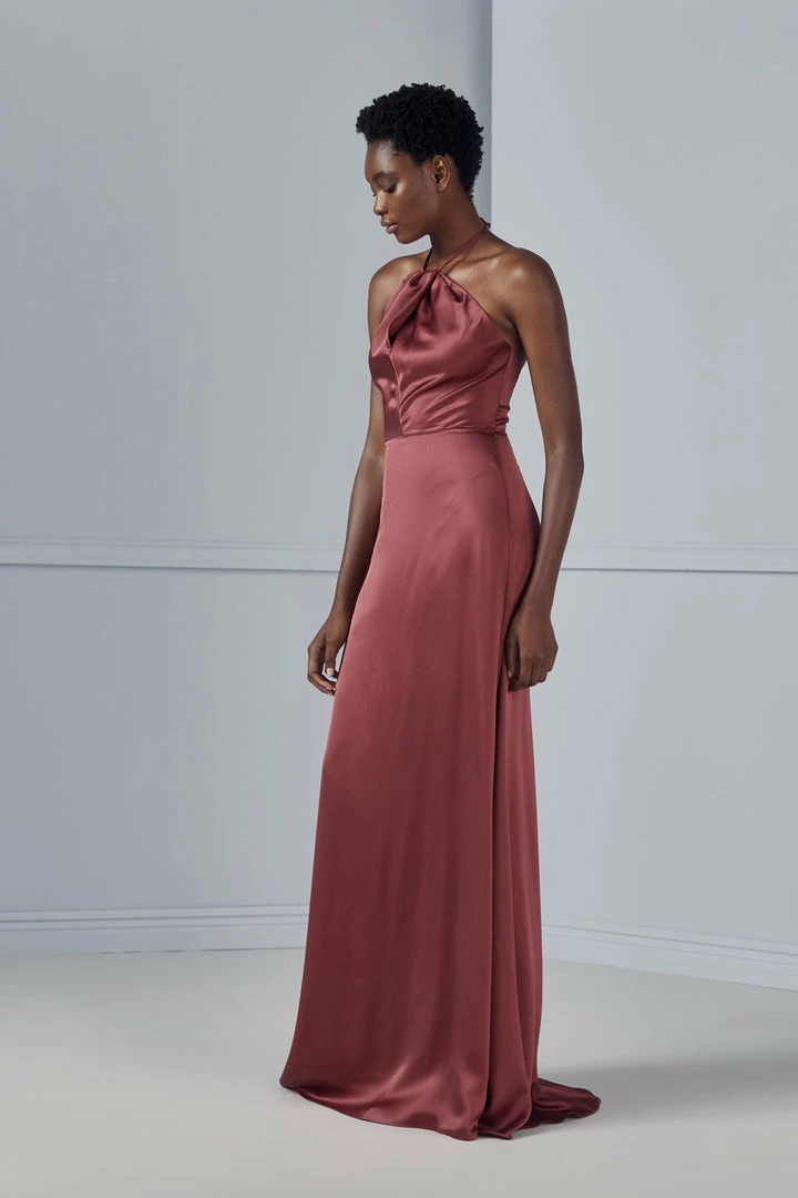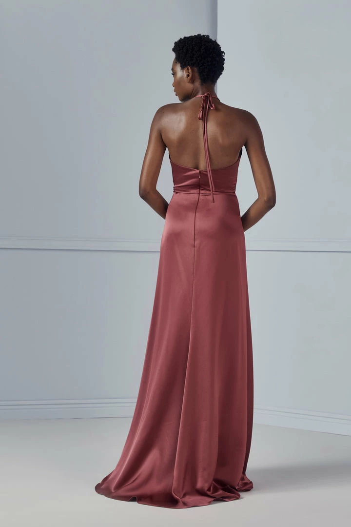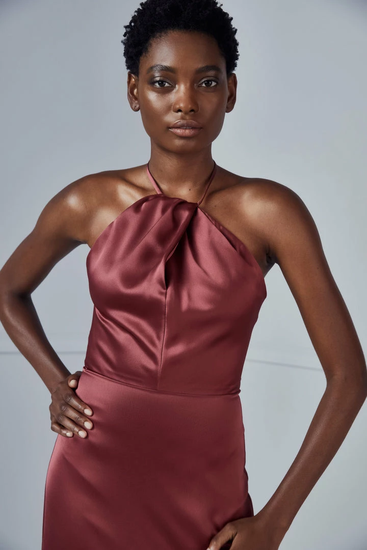 High-neck halter with twisted draping and side slit skirt in Fluid Satin