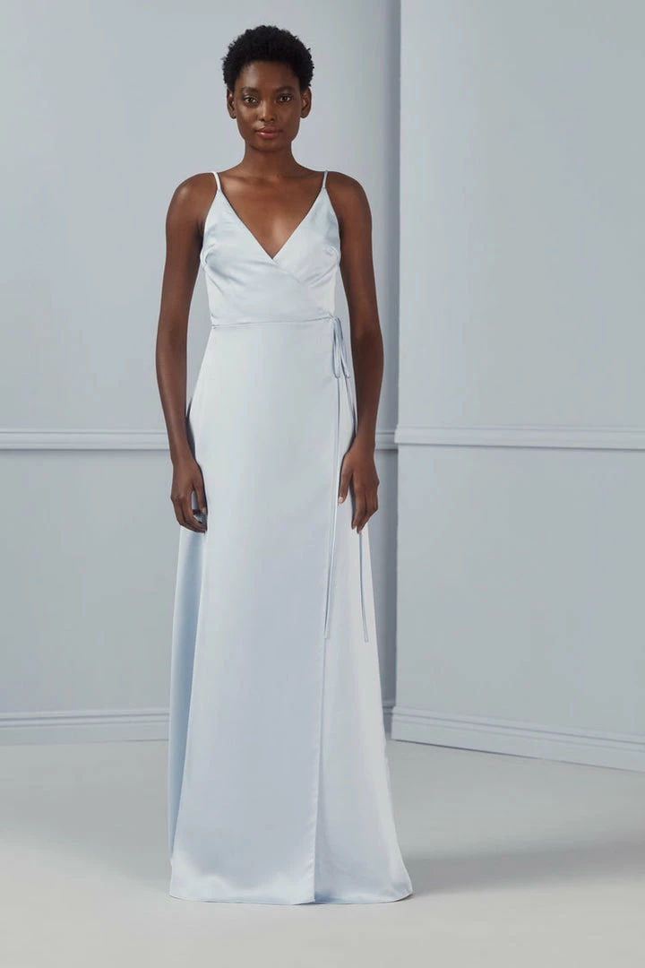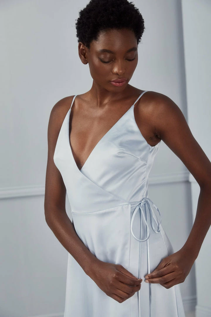 This fluid satin wrap dress conveys casual elegance. Its deep V front is mirrored by a shallower V at the back, revealing just enough skin to warrant an elegant updo and statement-making accessories.