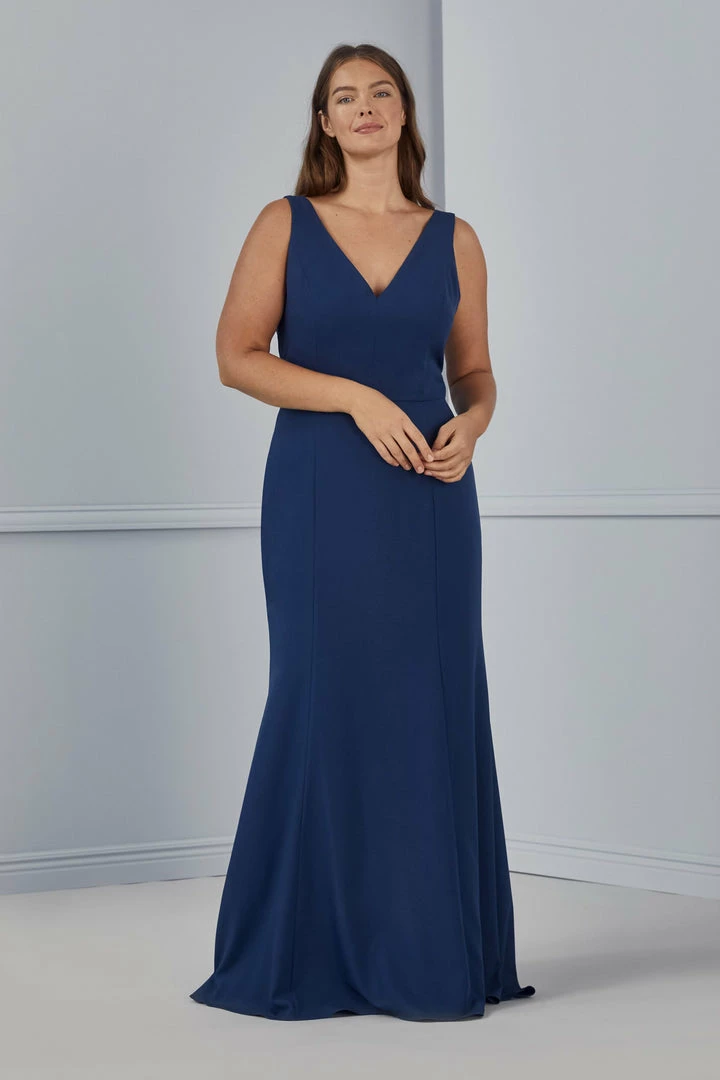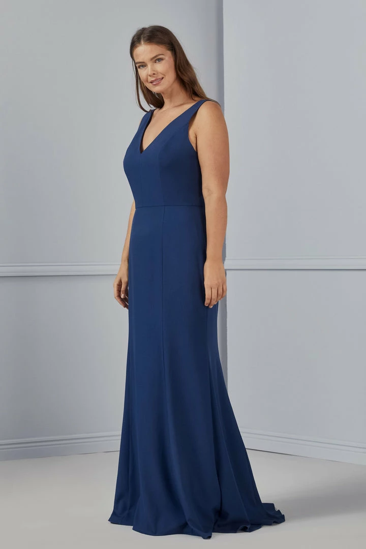 Tailored to deep Vs in the front and back of its form-fitting bodice, this dress is simply stunning in smooth crepe and finished with a softly flared skirt.