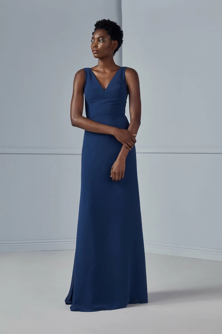 V-neck dress with V back and slim circle skirt in Flat Chiffon.