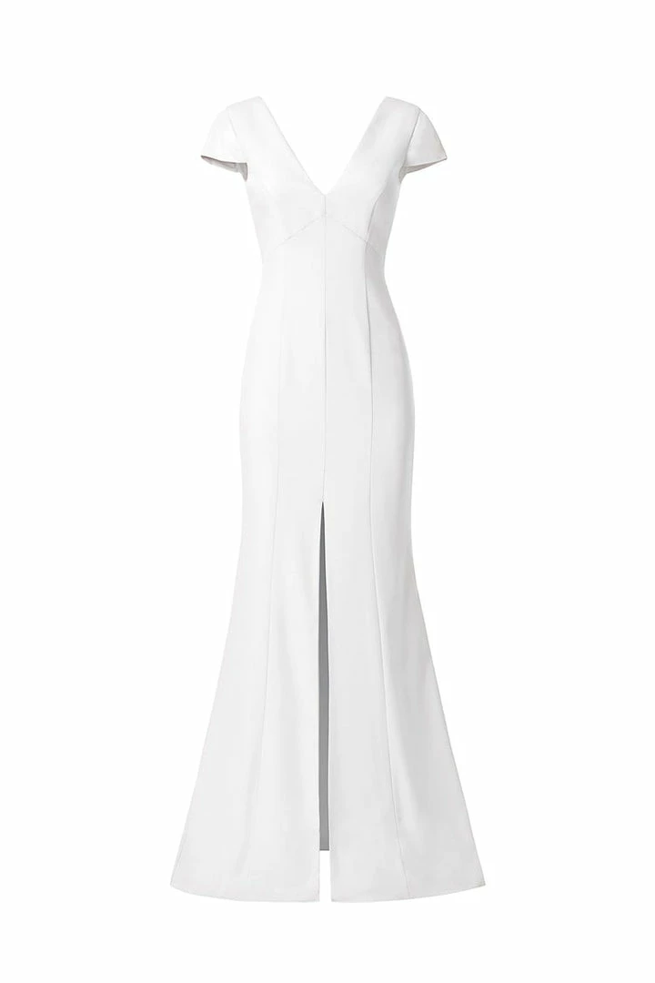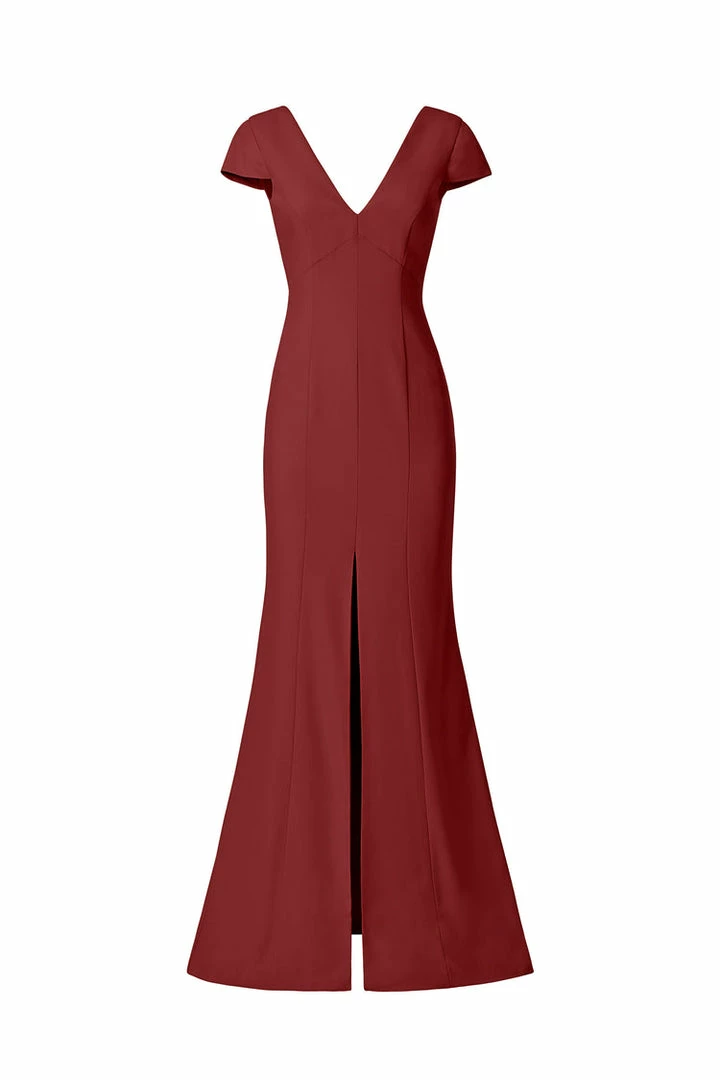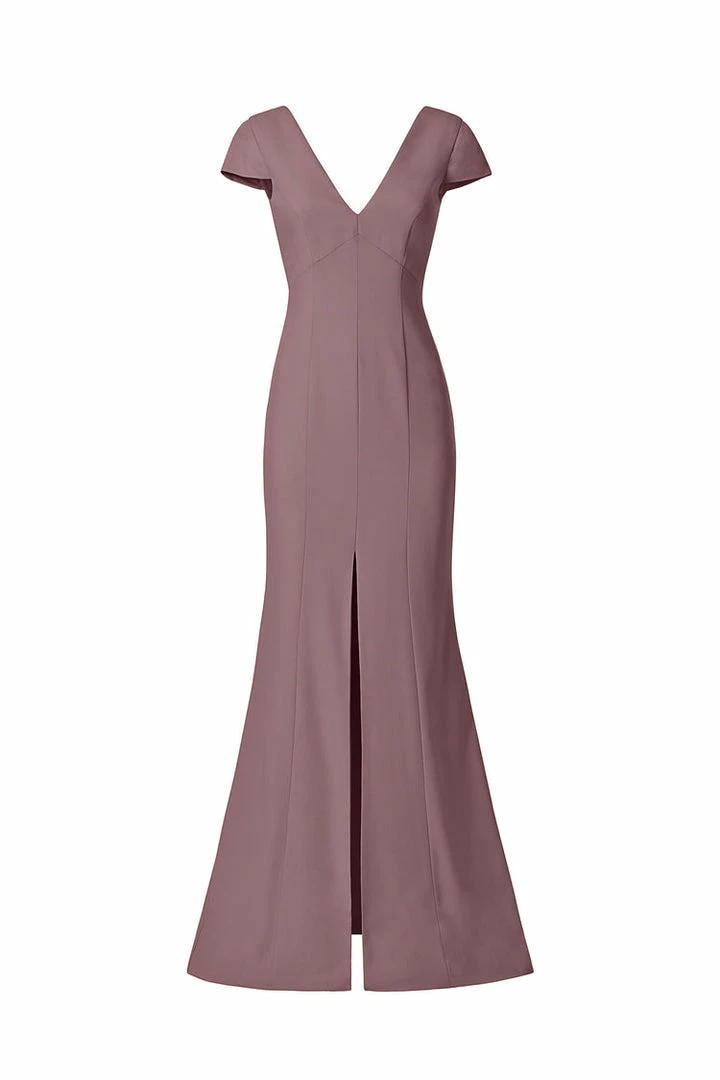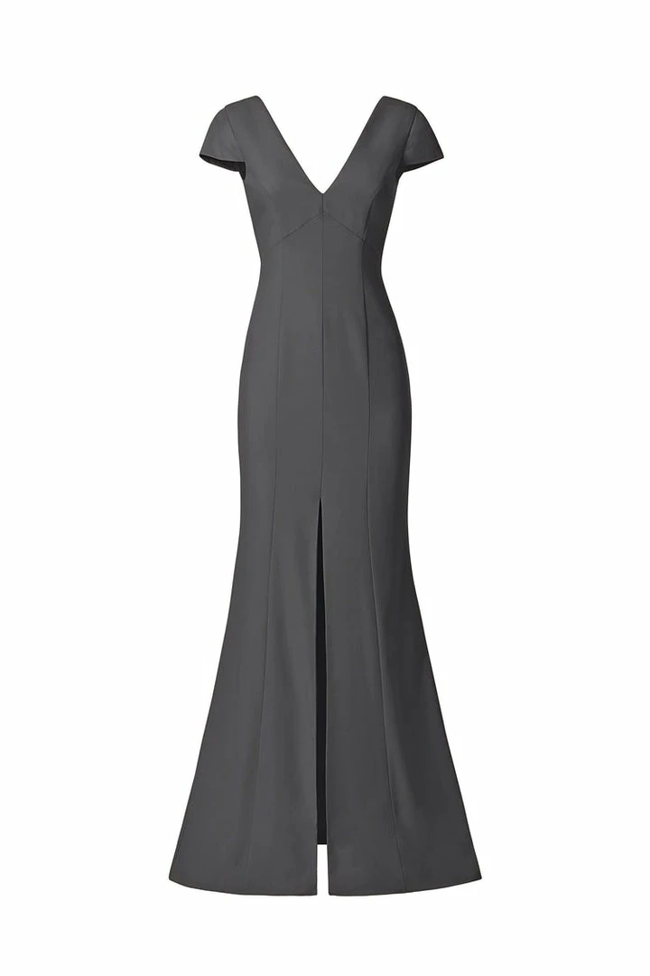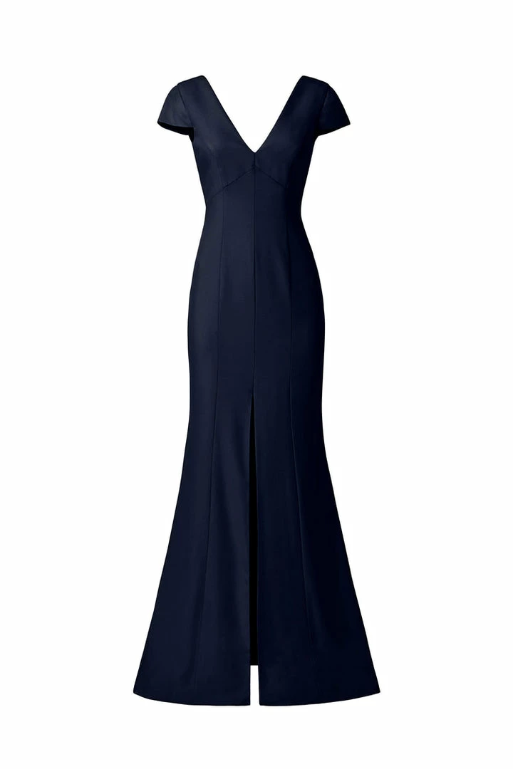 Cap sleeve V-neckline, fit-to-flare dress with slit in crepe.