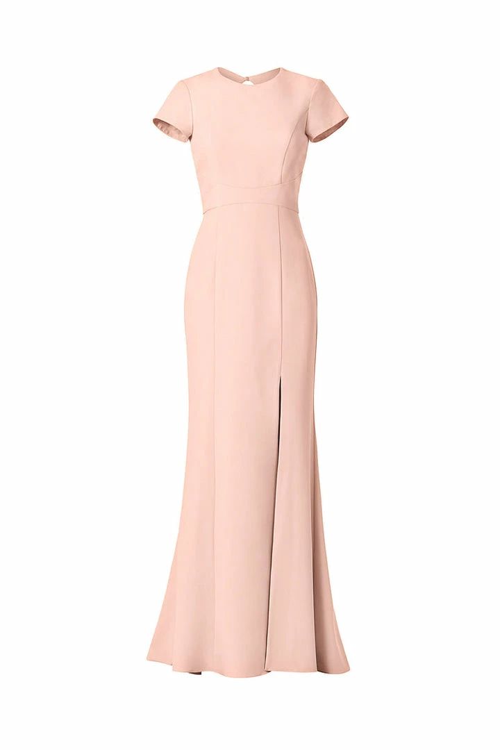 High neck tee shirt bodice with keyhole back and slit, fit to flare dress in crepe.