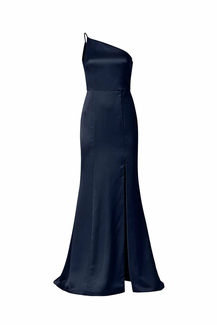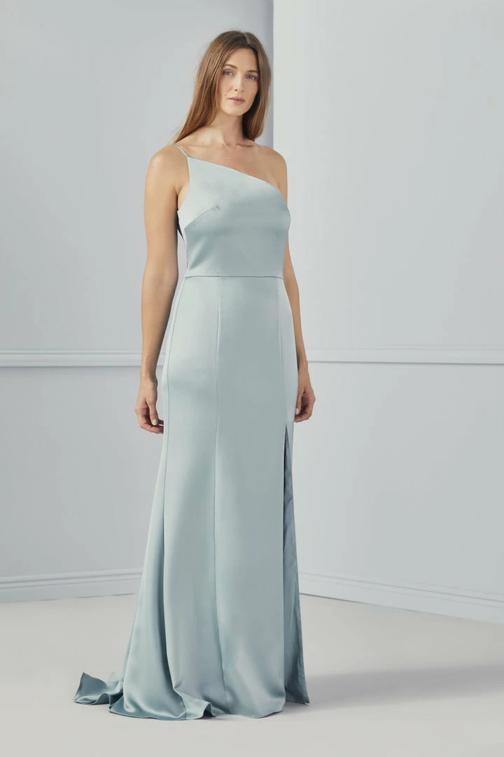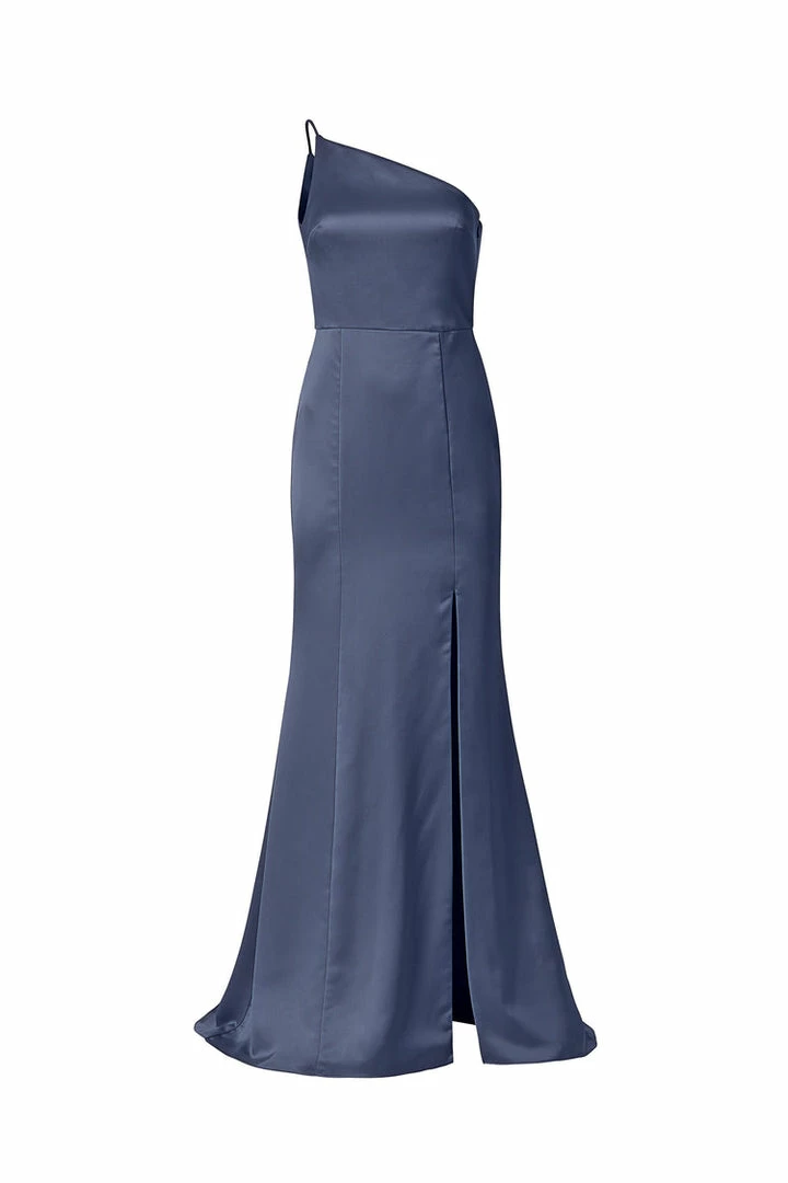 One-shoulder spaghetti strap dress with slit in fluid satin.
