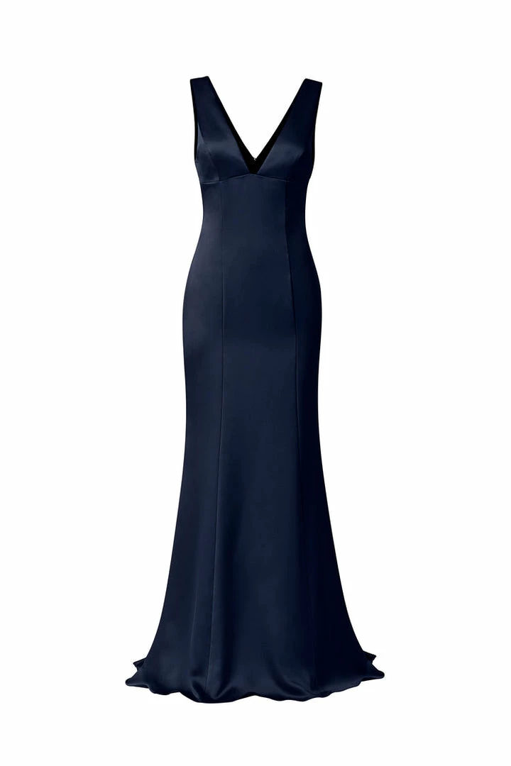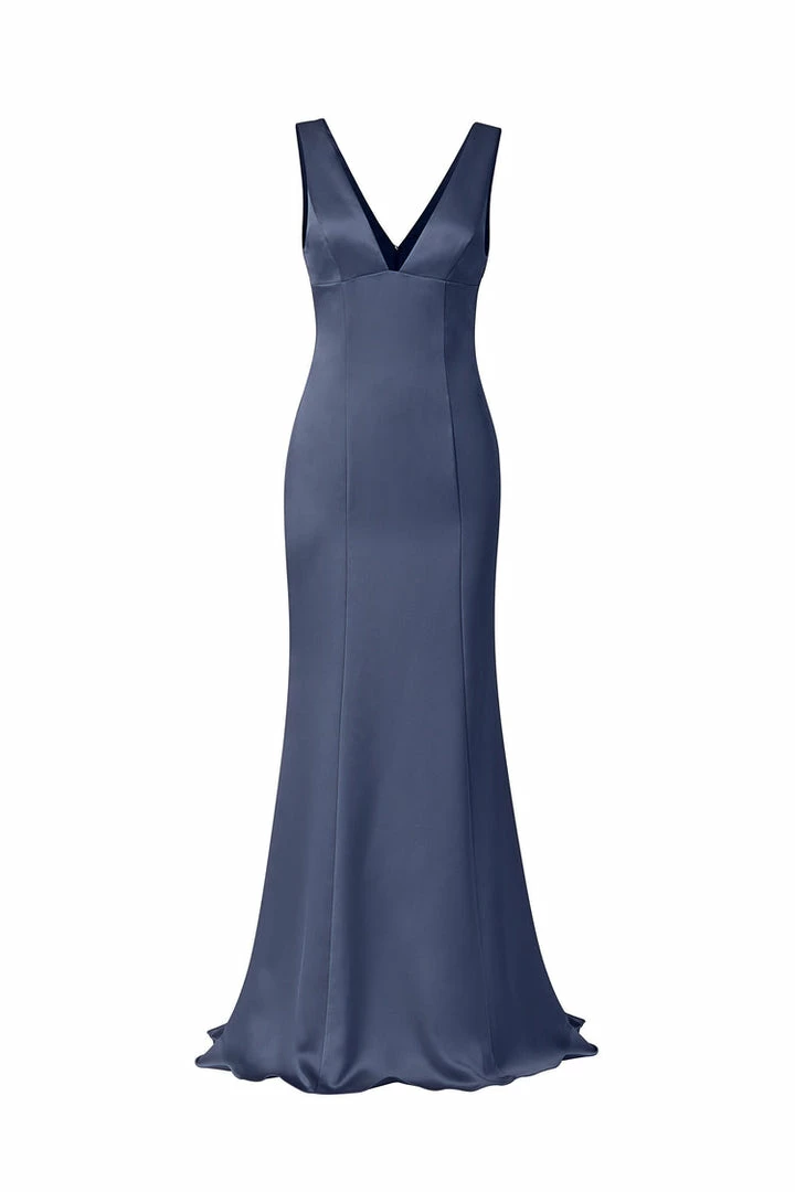Deep V bridesmaids dress with empire bodice and V back in fluid satin.