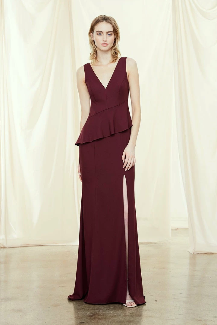 Bridesmaids dress with V front and back and ruffle peplum skirt with slit in crepe.