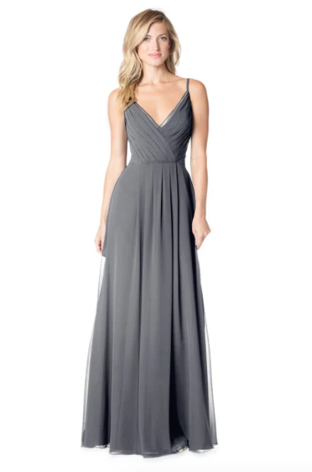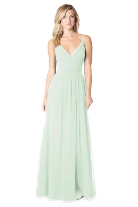 Bari Jay Bridesmaid Dress 1622 – Spaghetti strap dress with pleated V-Neck Bodice, Sheer trim neckline and Sheer side panels, and center front pleated skirt.