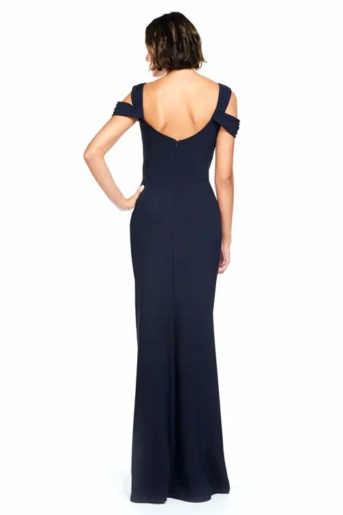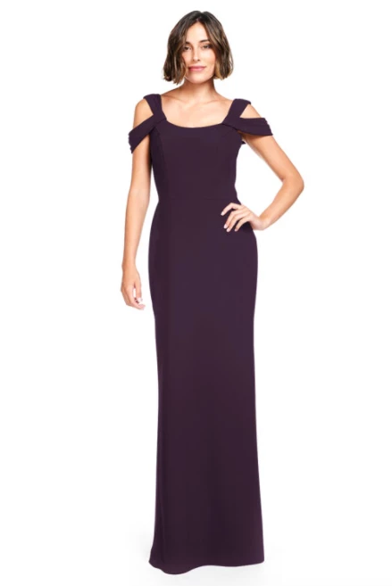 Wide strapped round neckline with pleated off the shoulder drapes and straight skirt.