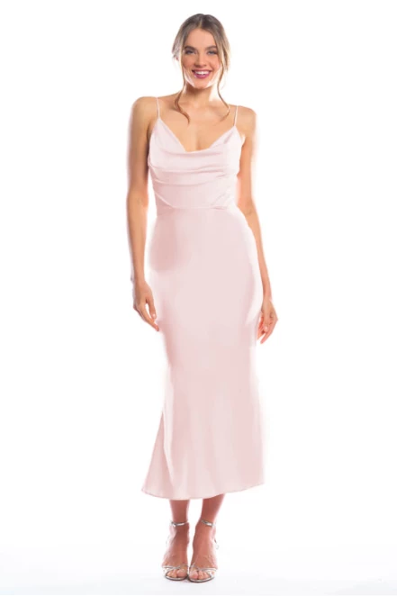 Spaghetti strap cowl neck bodice with a slim-fit midi-length skirt.