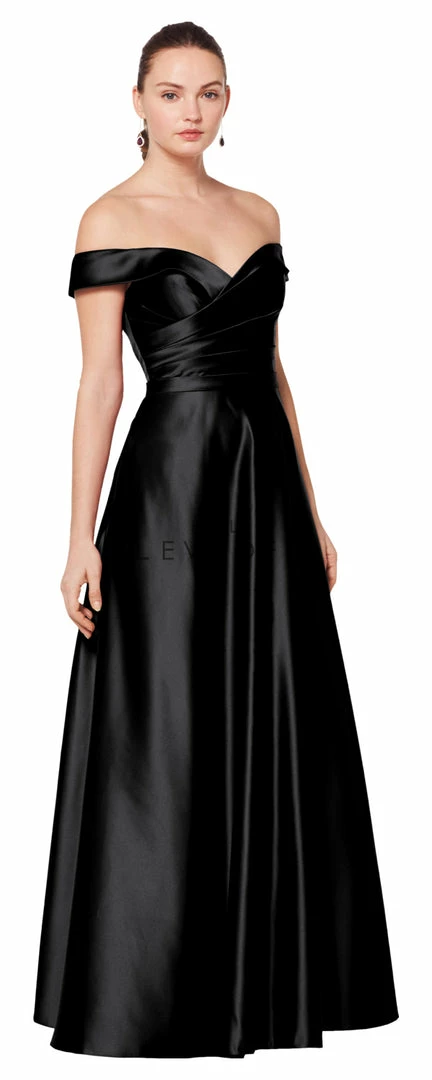 - European Satin off-the-shoulder gown with a portrait neckline.