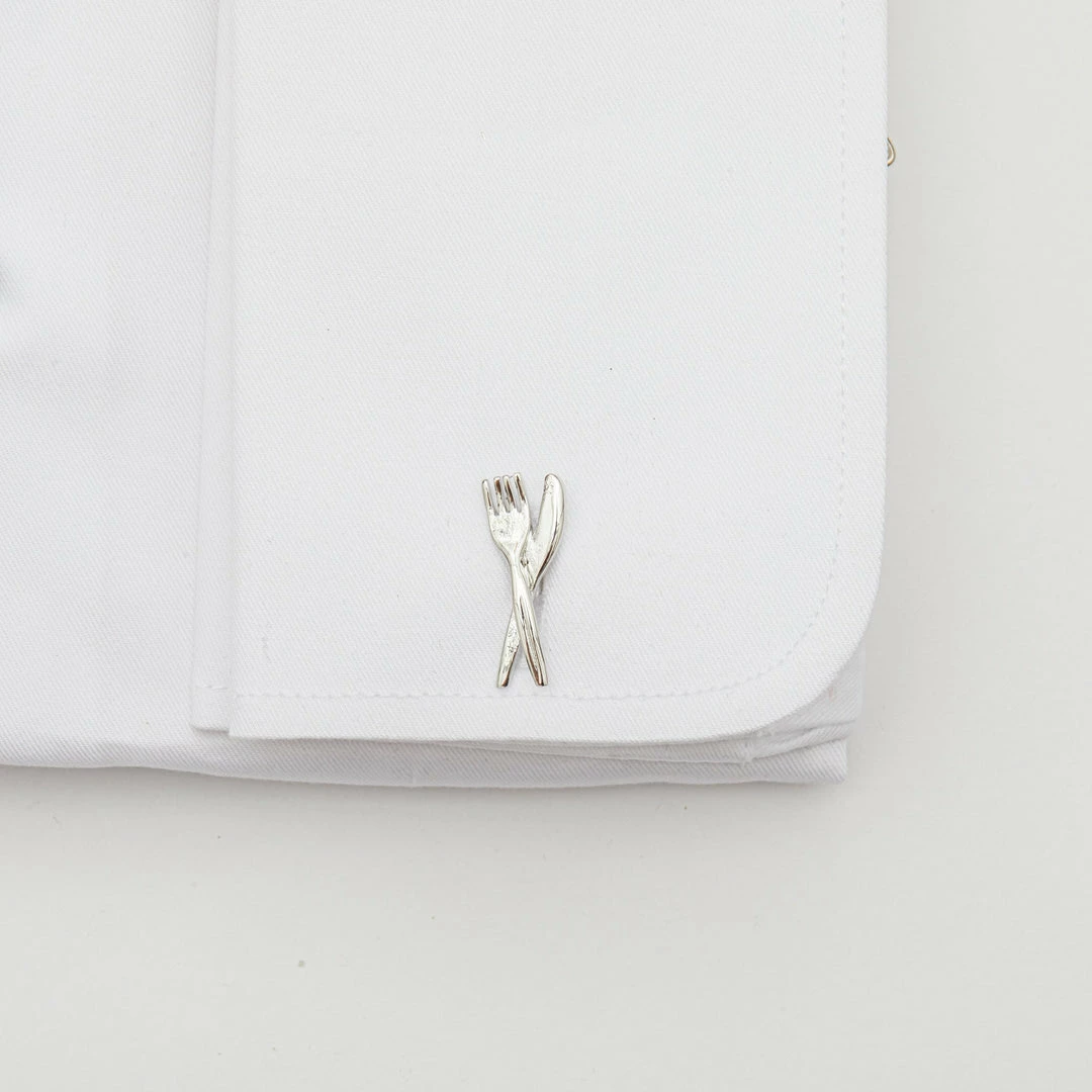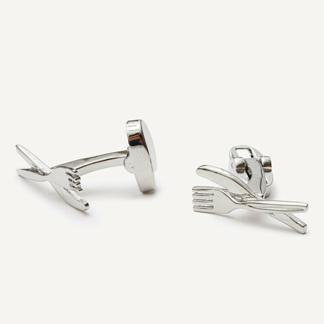 These silver fork and knife cuff links are a fun eye catching statement for any wardrobe. An accessory like this matches with almost anything, making it perfect for the work day or try dressing it up for weddings and special occasions.