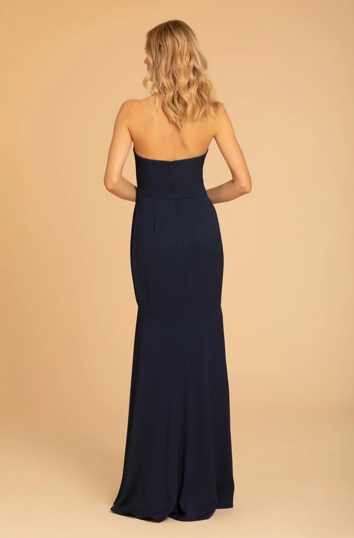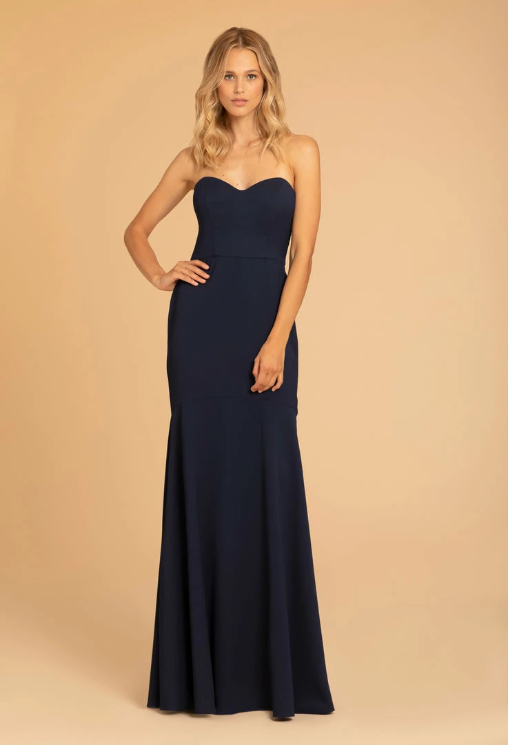 Crepe fit to flare gown, sweetheart strapless neckline with detachable sleeves, natural waist.