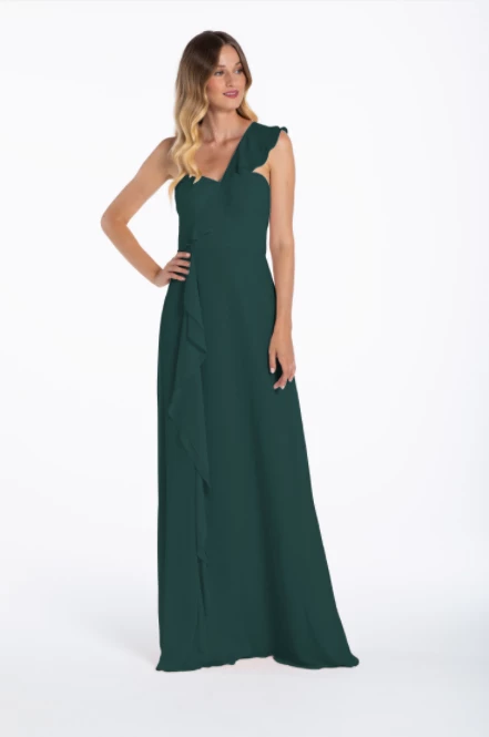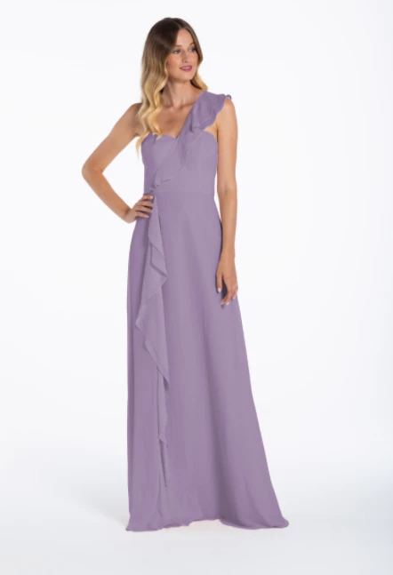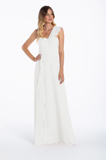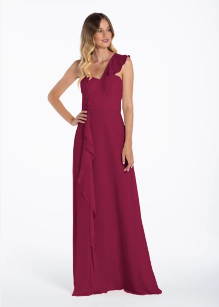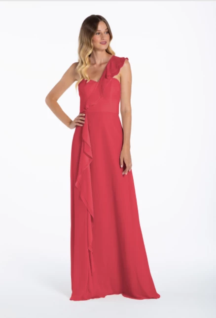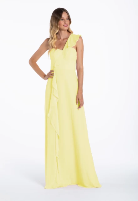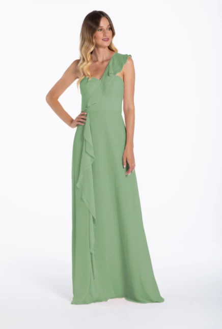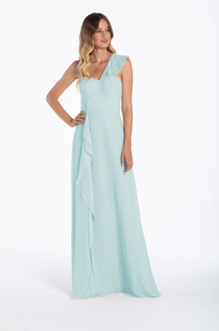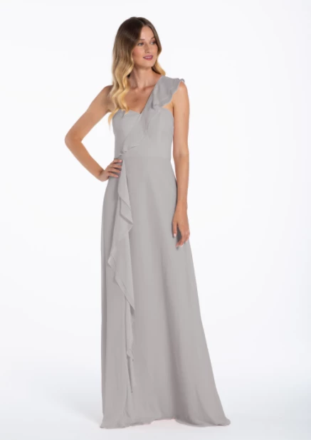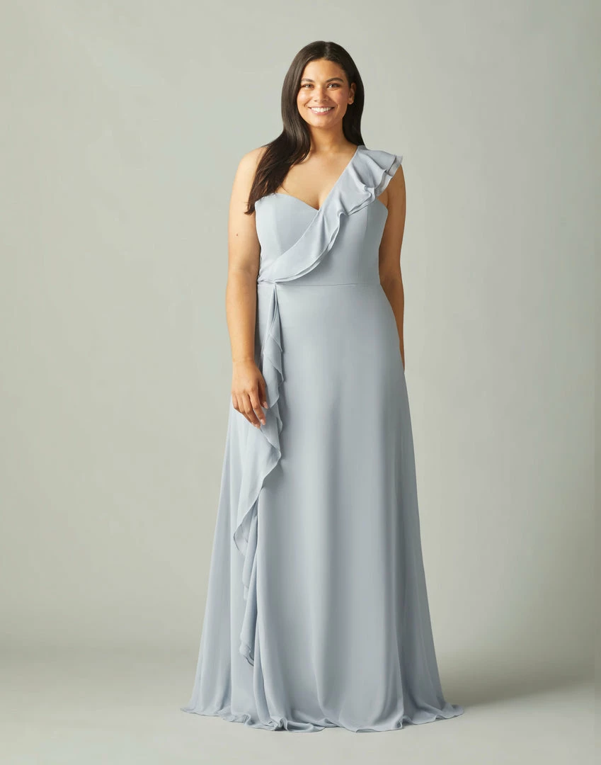 Chiffon A-line gown, ruffle one shoulder neckline, natural waist, ruffle detail on skirt.
