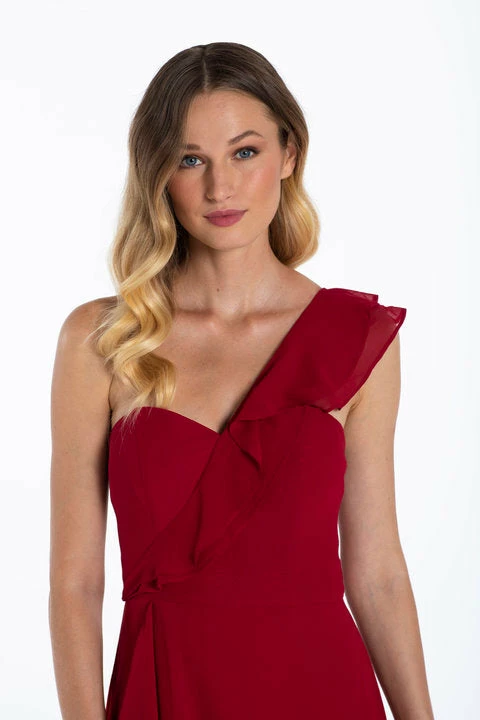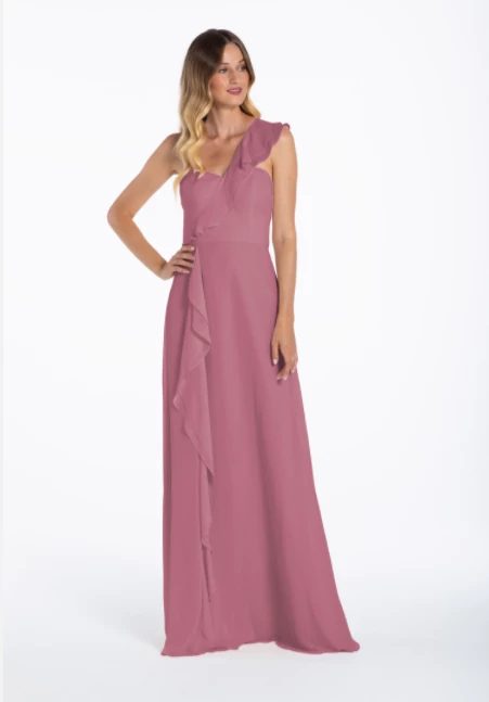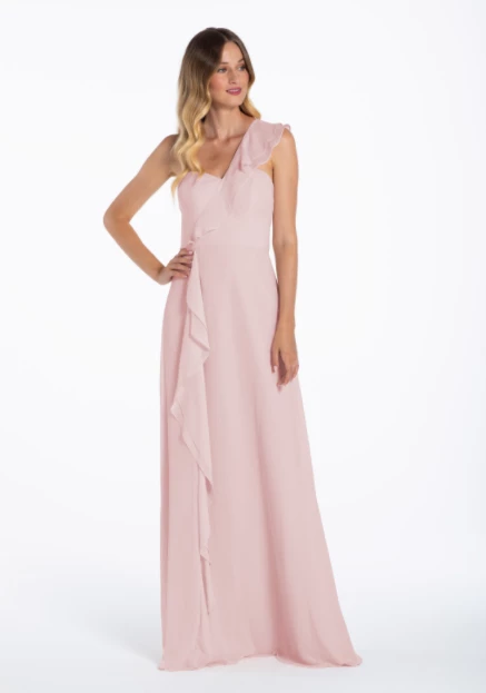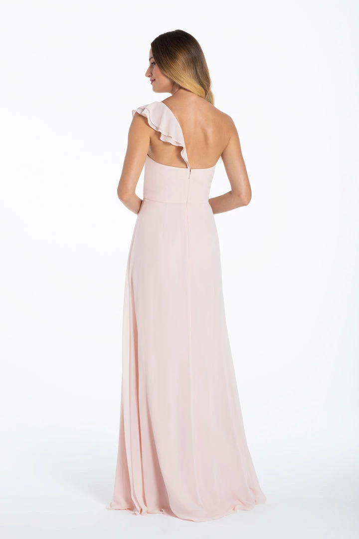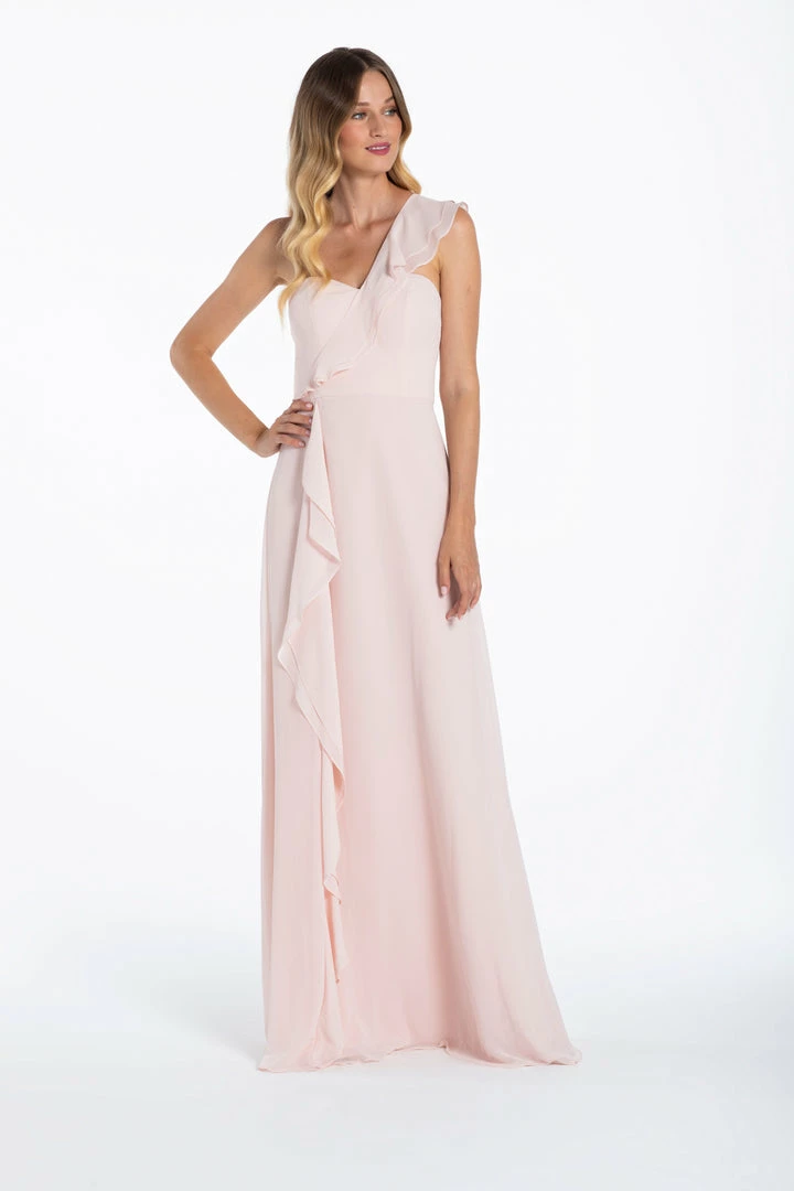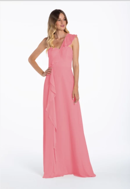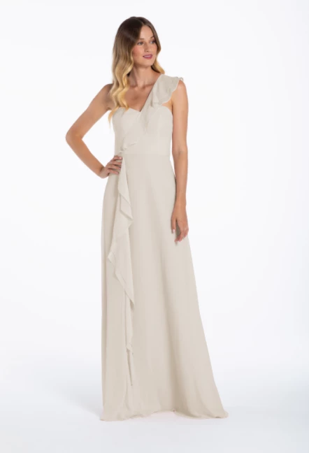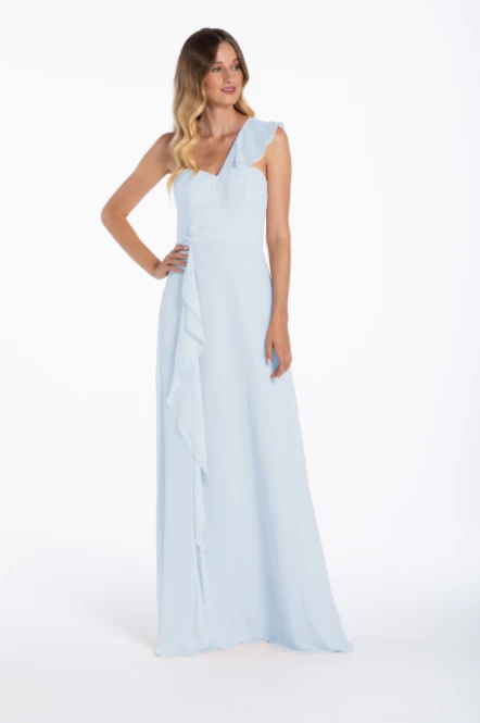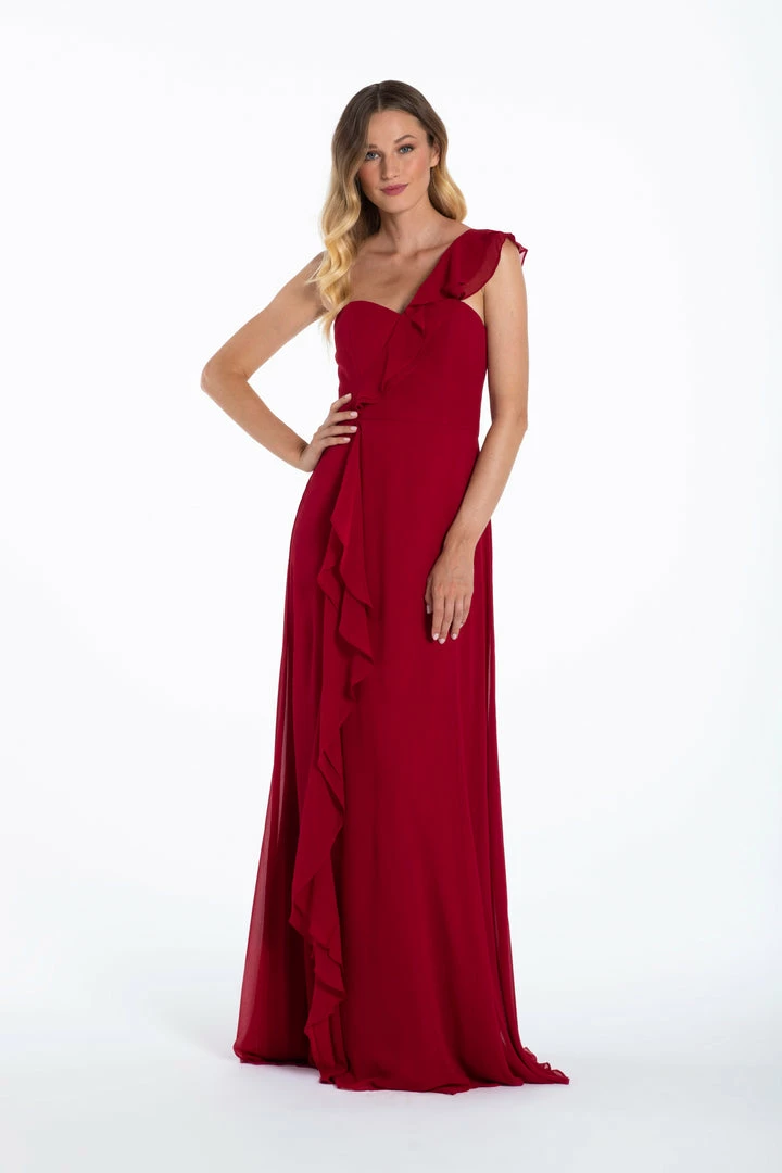 Chiffon A-line gown, ruffle one shoulder neckline, natural waist, ruffle detail on skirt.