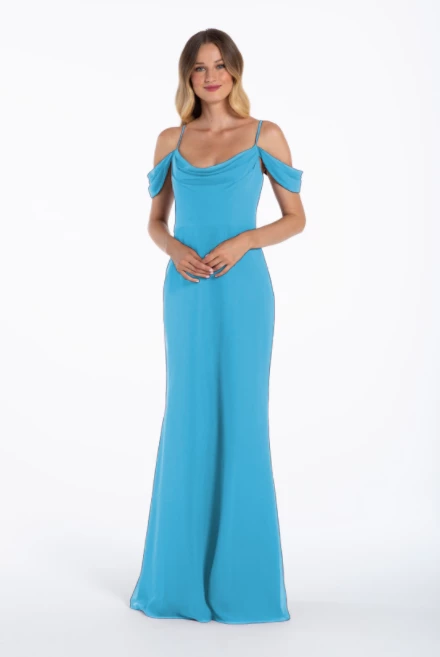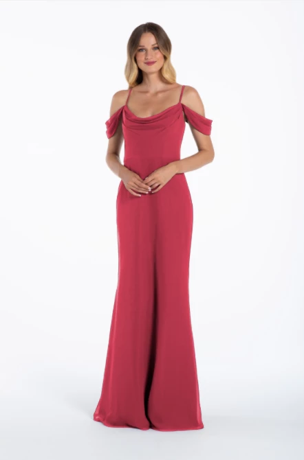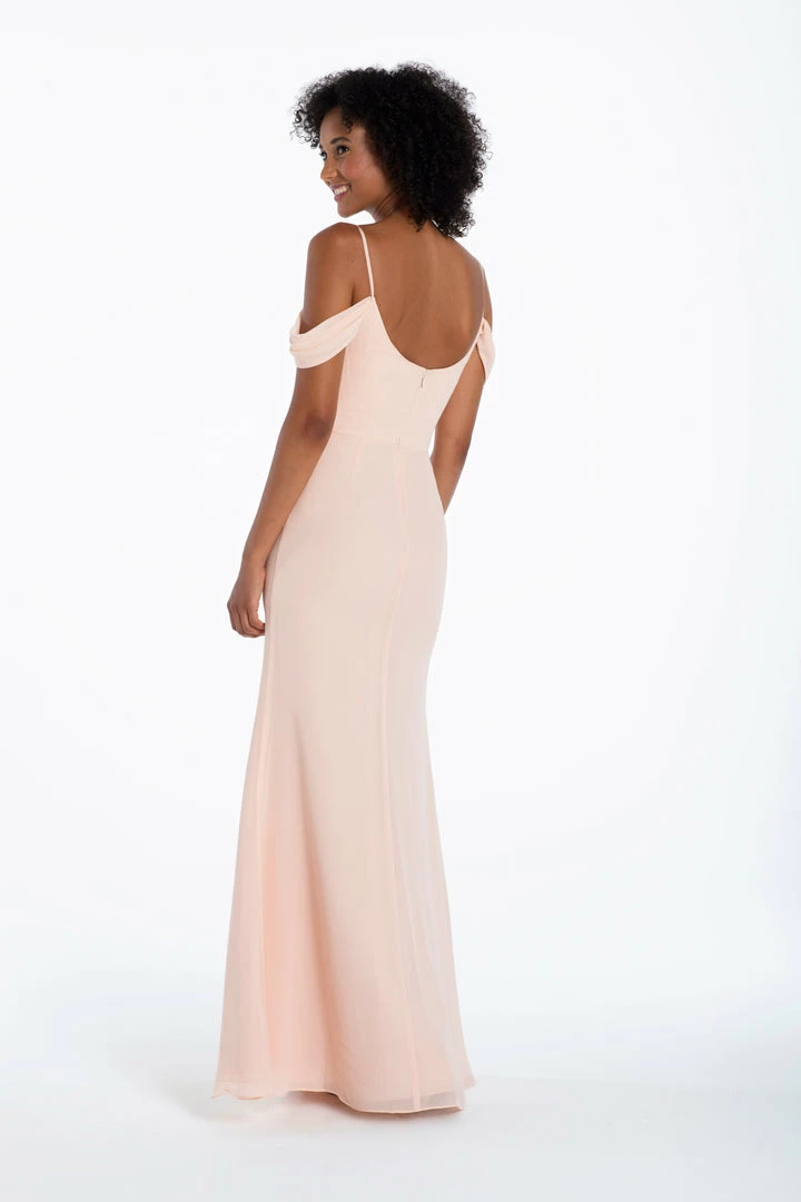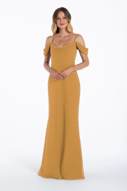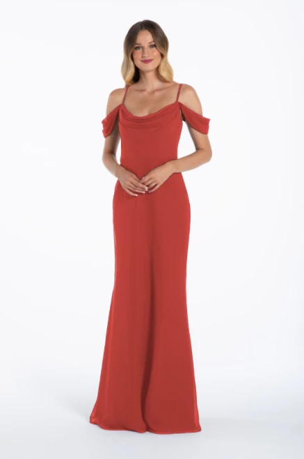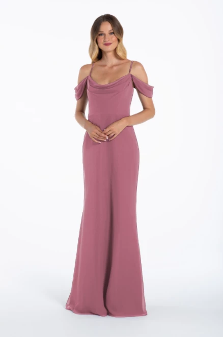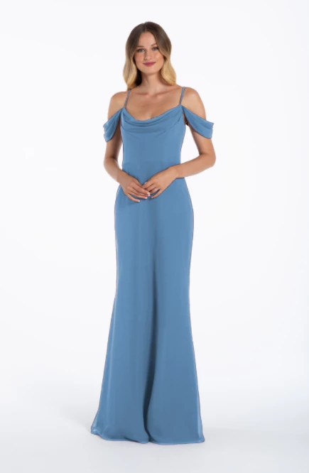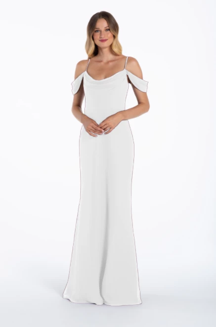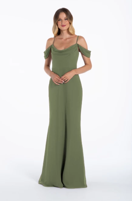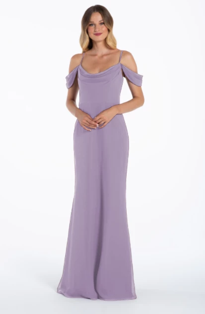 Chiffon A-line gown, cowl neckline with off the shoulder detail, natural waist.