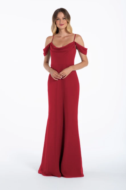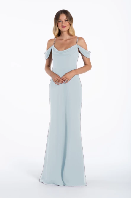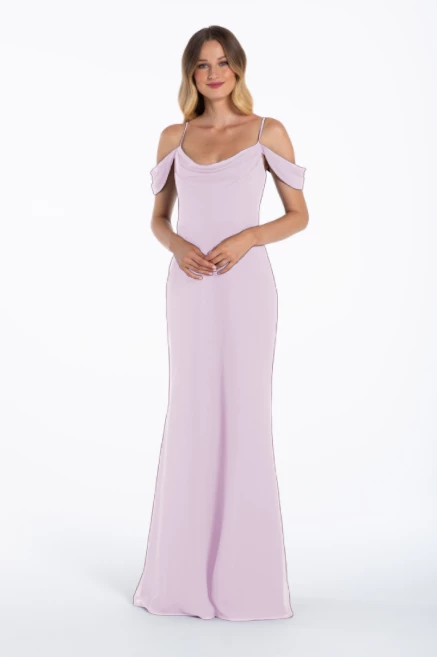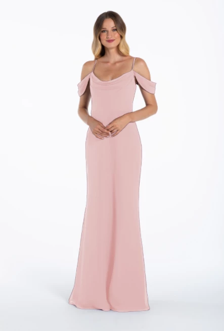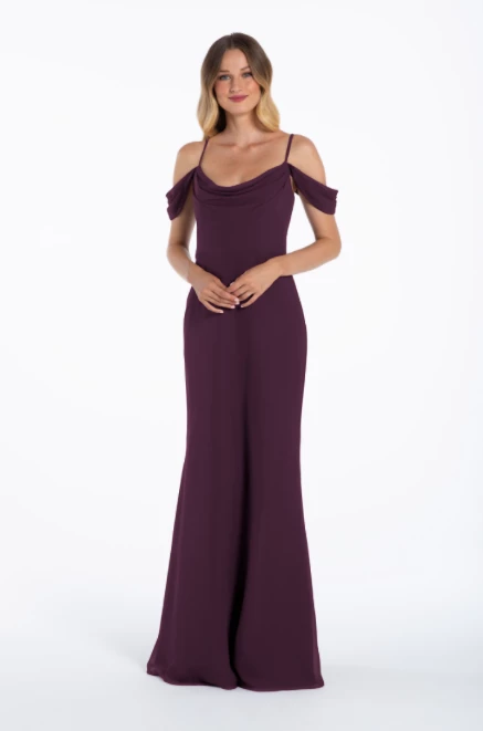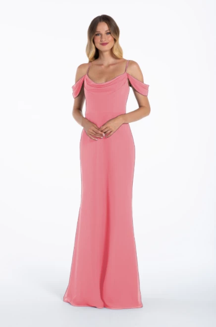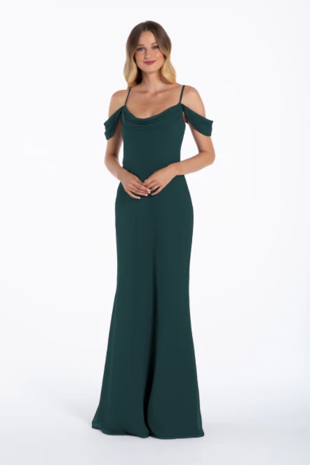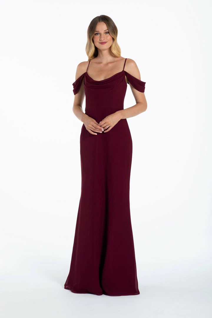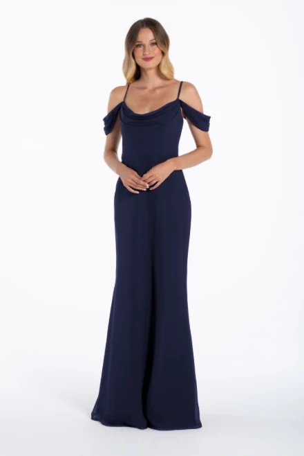 Chiffon A-line gown, cowl neckline with off the shoulder detail, natural waist.
