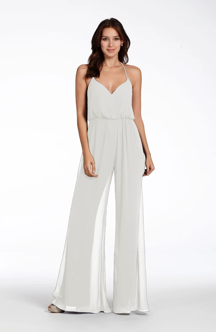 Hayley Paige Occasions bridesmaids dress – Indigo chiffon jumpsuit, bloused bodice with curved V-neckline and side slits at hem.