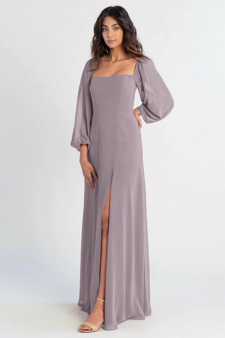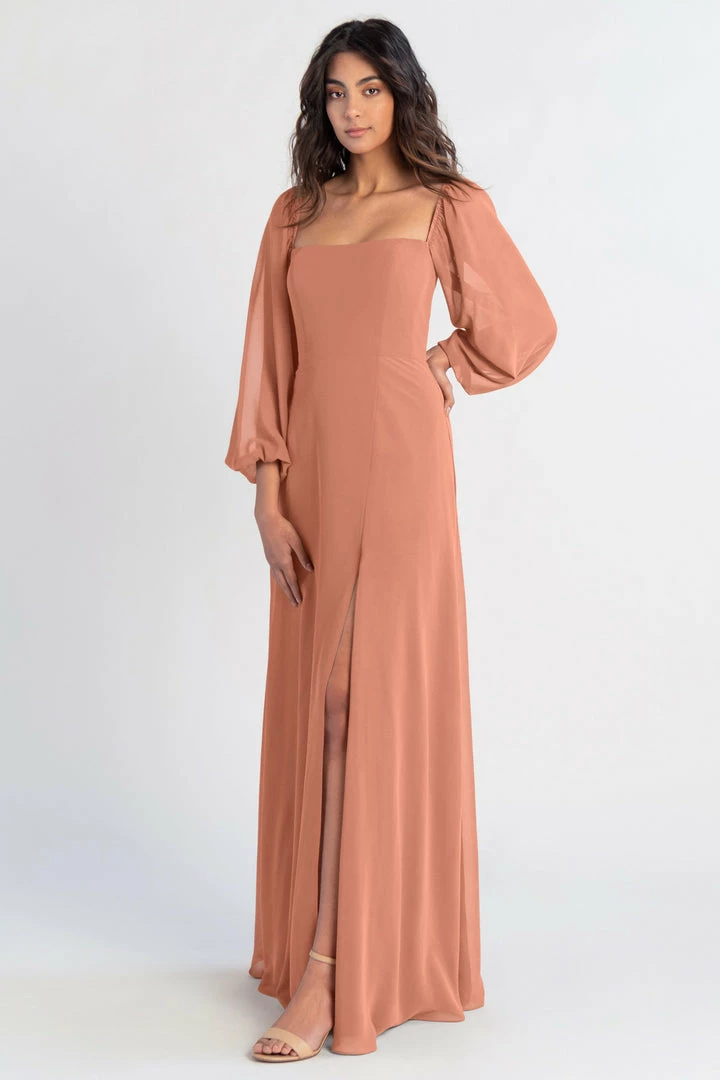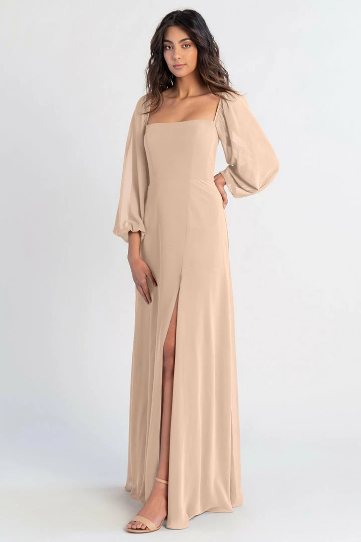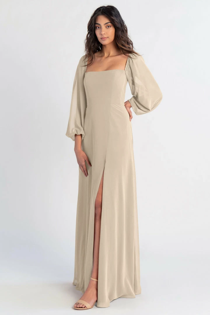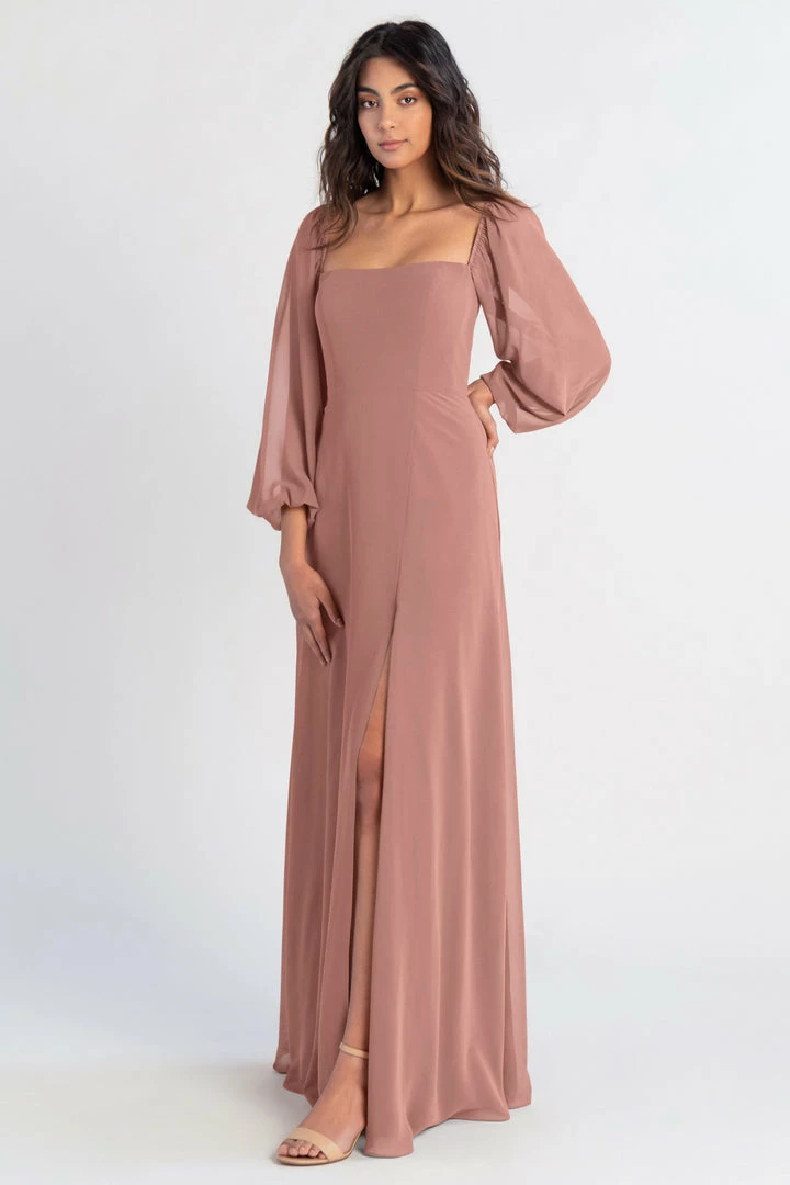The Althea long sleeve chiffon bridesmaid dress is a bohemian beauty with a clean, modern edge. Billowing sheer sleeves are balanced beautifully by a structured bodice and straight neckline. The flowing A-line skirt has a slit to reveal a peek of skin.