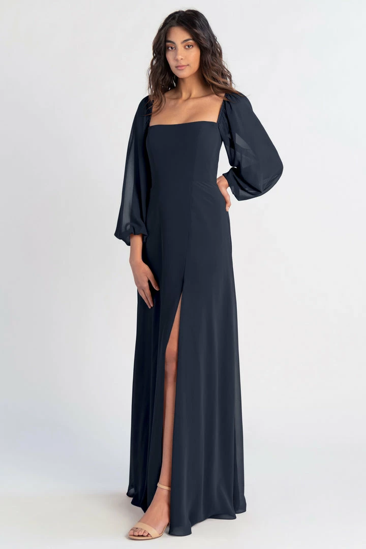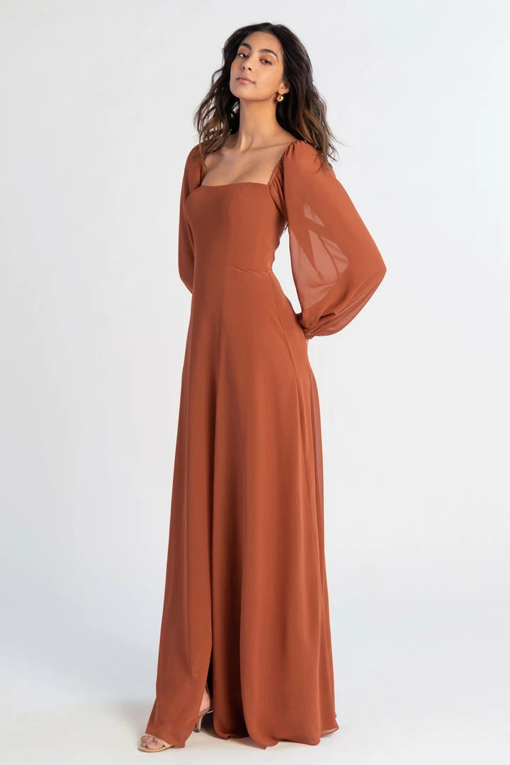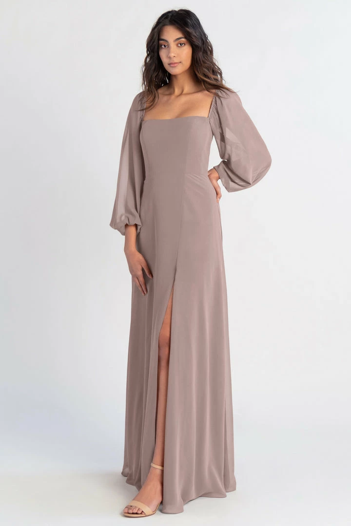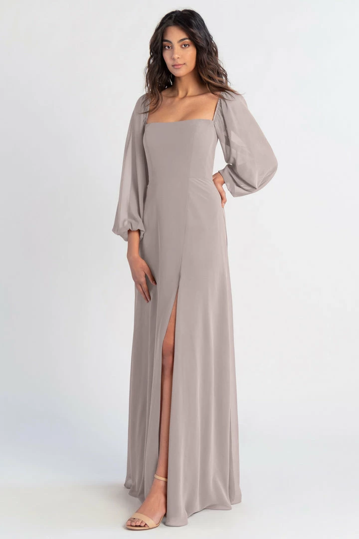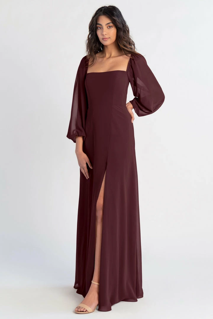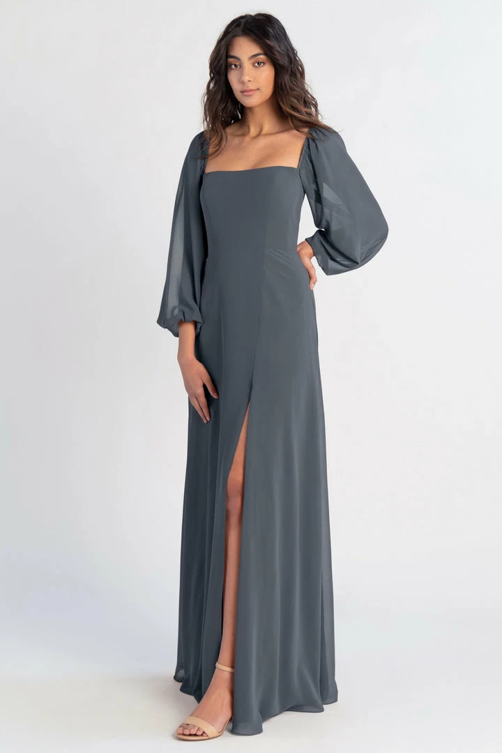 The Althea long sleeve chiffon bridesmaid dress is a bohemian beauty with a clean, modern edge. Billowing sheer sleeves are balanced beautifully by a structured bodice and straight neckline. The flowing A-line skirt has a slit to reveal a peek of skin.