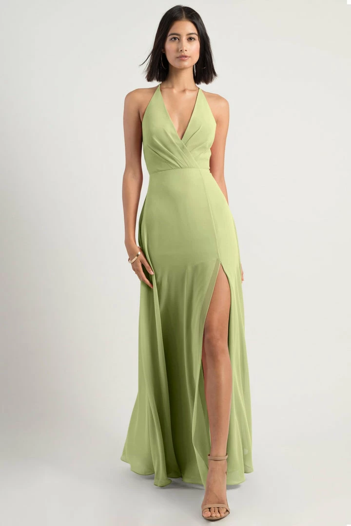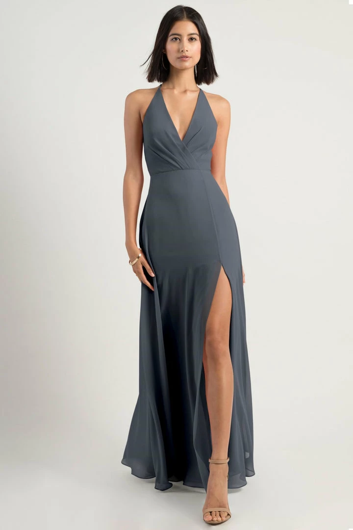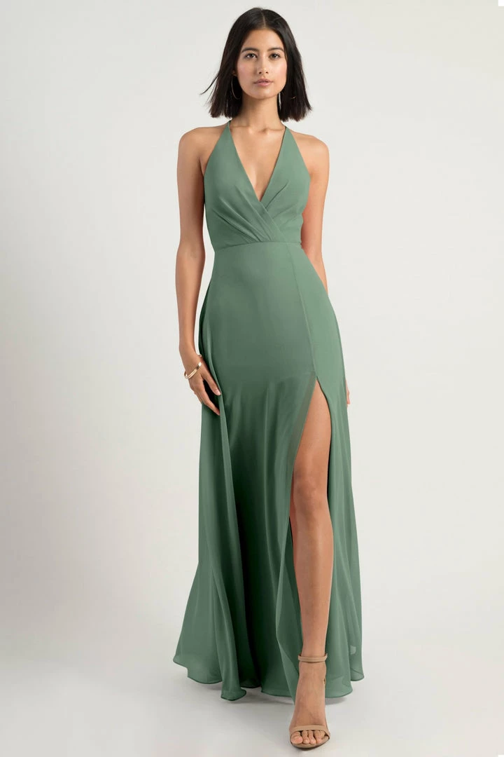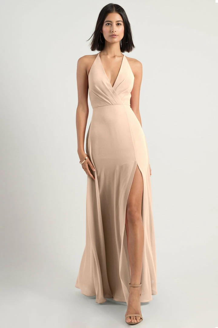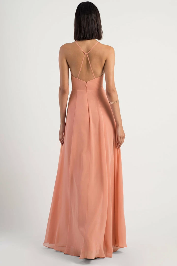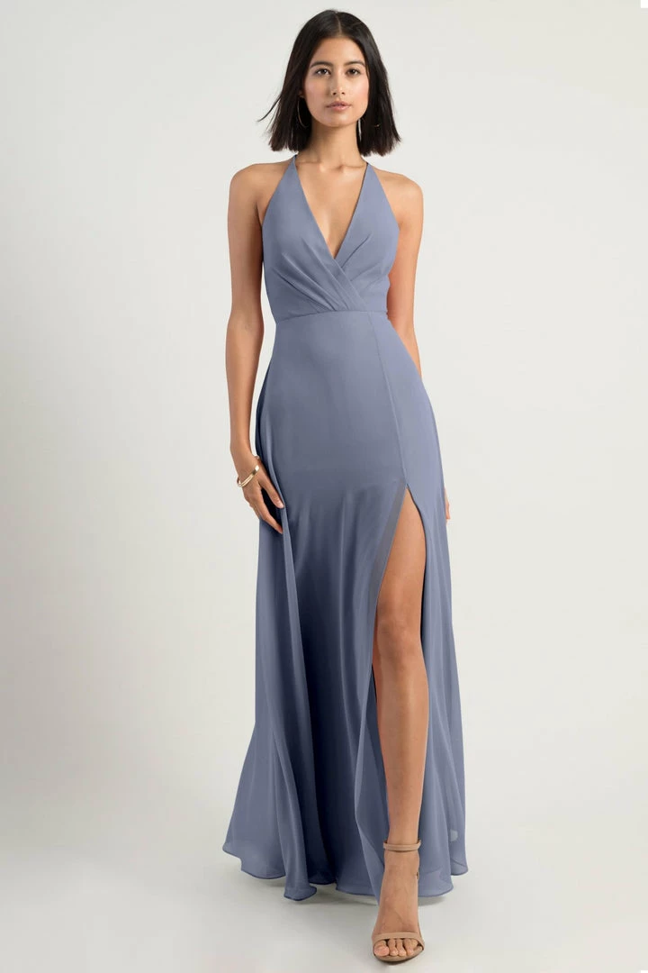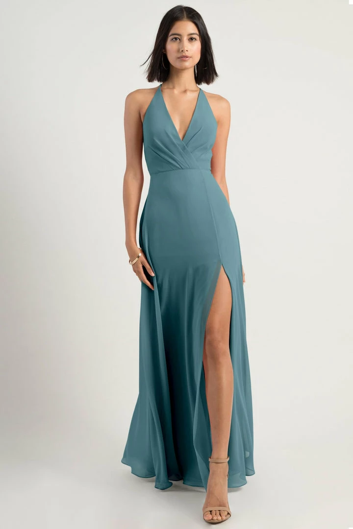 The Bryce dress is a sophisticated, yet playful A-line silhouette with a V halter neckline in our flowy Luxe Chiffon. The classic surplice bodice is updated with a low back and clean spaghetti straps with a hook and eye closure.