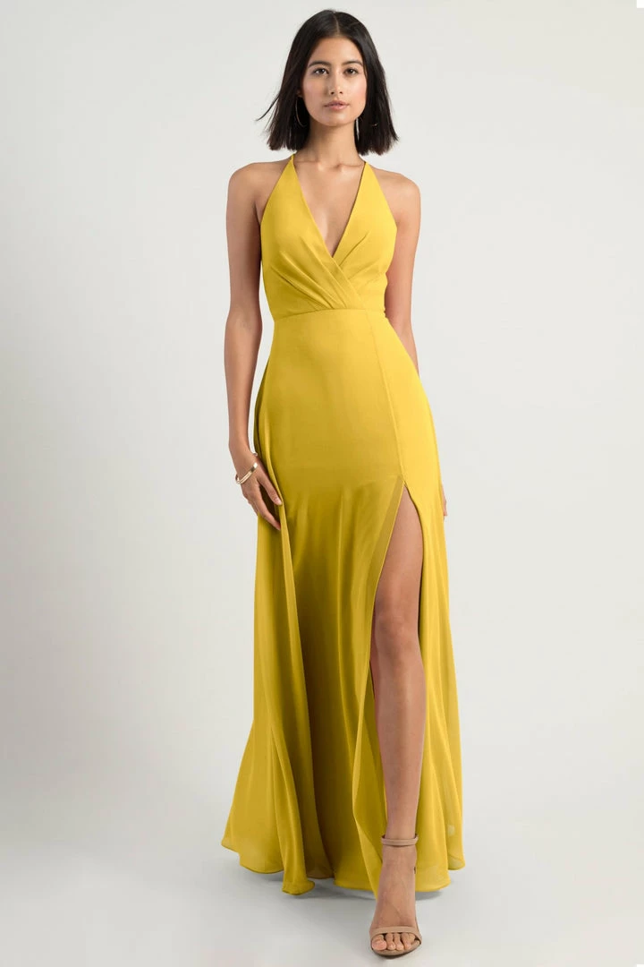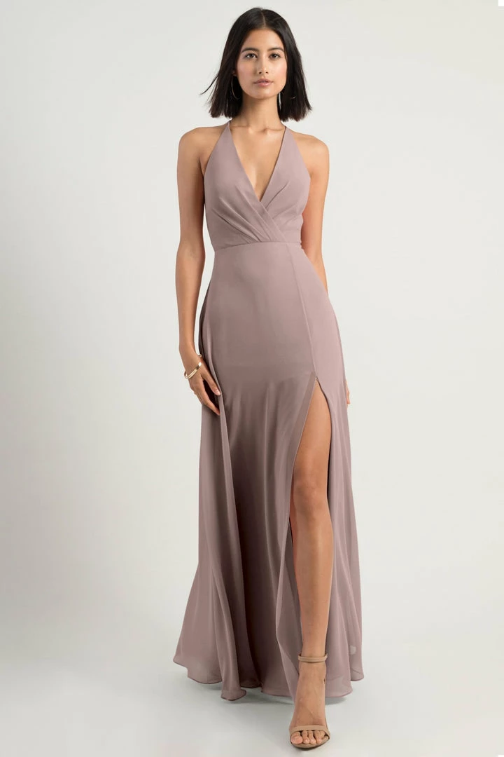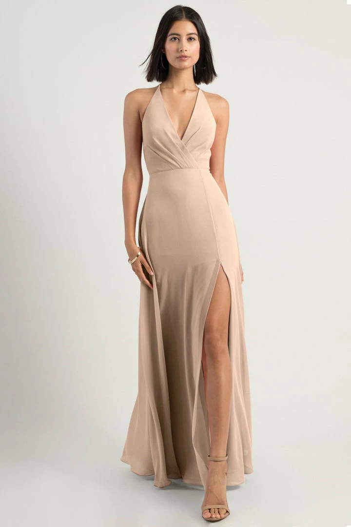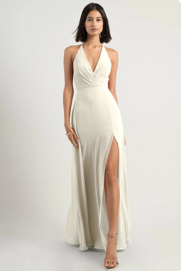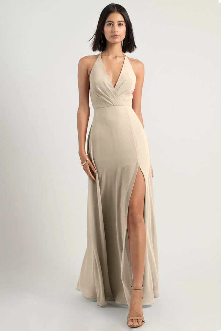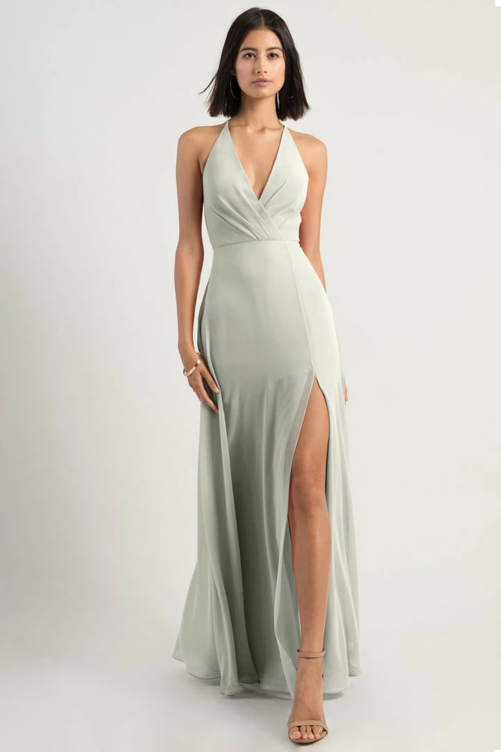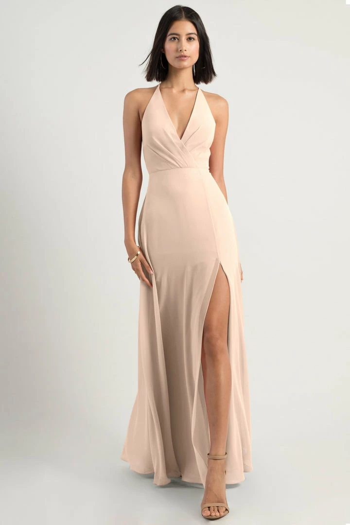 The Bryce dress is a sophisticated, yet playful A-line silhouette with a V halter neckline in our flowy Luxe Chiffon. The classic surplice bodice is updated with a low back and clean spaghetti straps with a hook and eye closure.