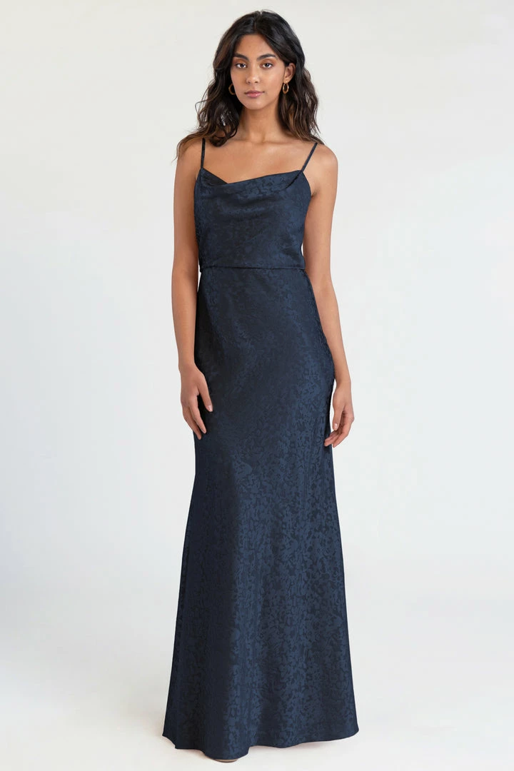 The Dahlia Gemma satin bridesmaid dress features a soft cowl neckline and flattering blouson waist. The slim A-line skirt is cut on the bias and skims your curves beautifully. The luxuriously textured Gemma satin burnout fabric makes this dress a welcomed addition to a mix match bridal party.