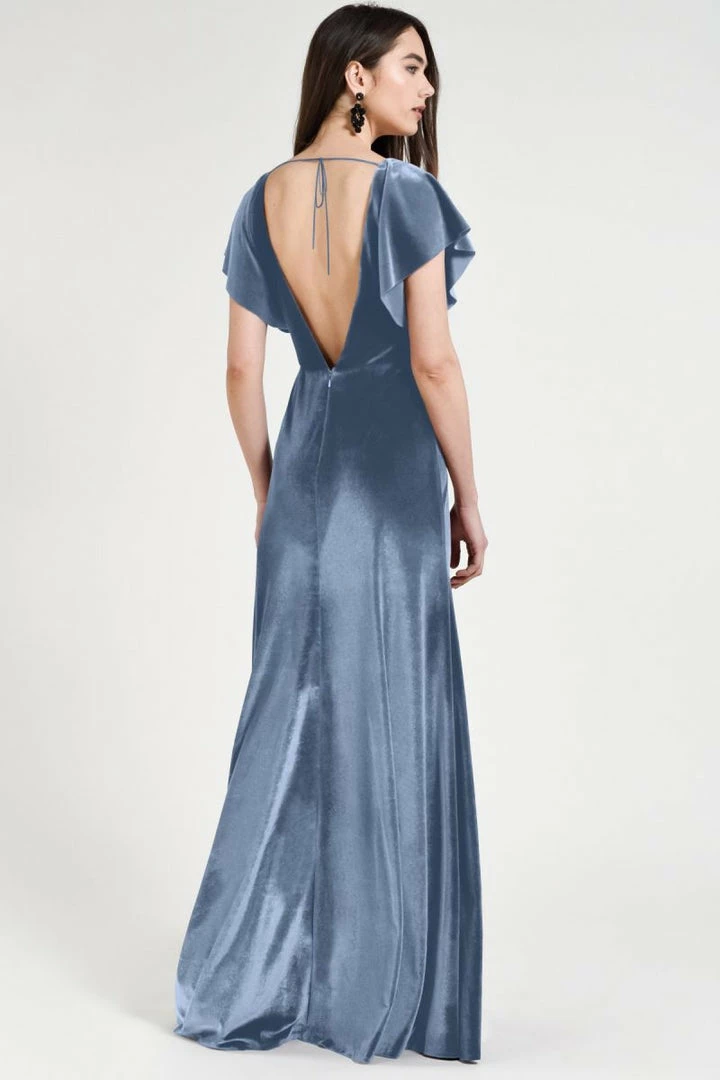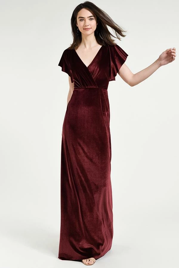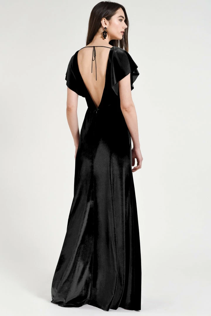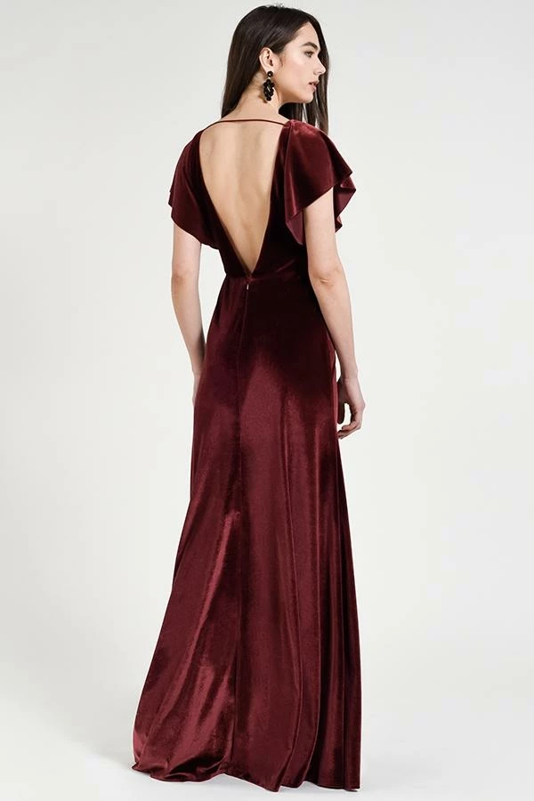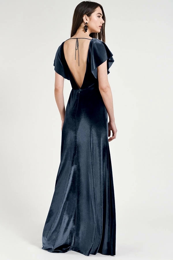 Soft flutter sleeves and a chic open back make the Ellis gown effortlessly elegant in our luxuriously soft Stretch Velvet.