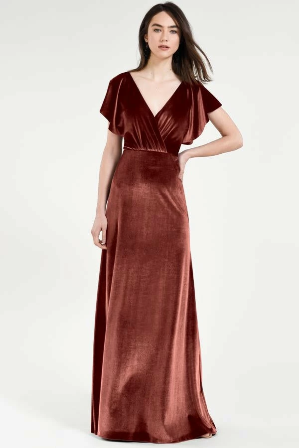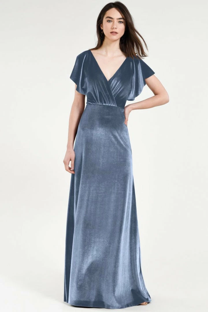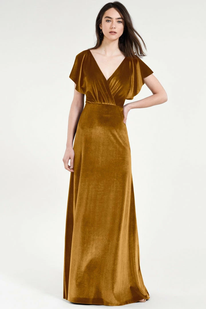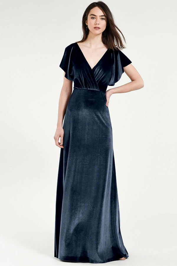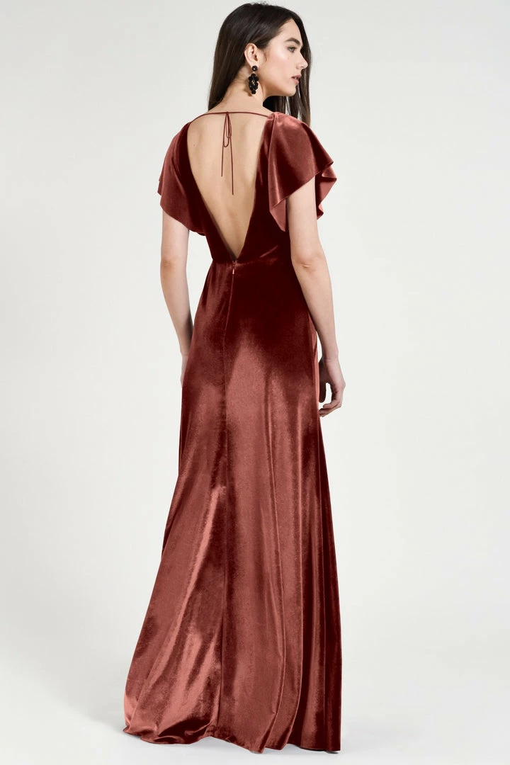 Soft flutter sleeves and a chic open back make the Ellis gown effortlessly elegant in our luxuriously soft Stretch Velvet.