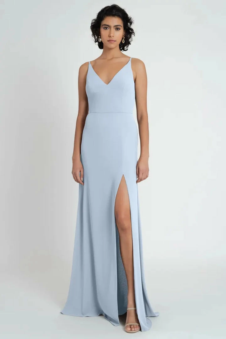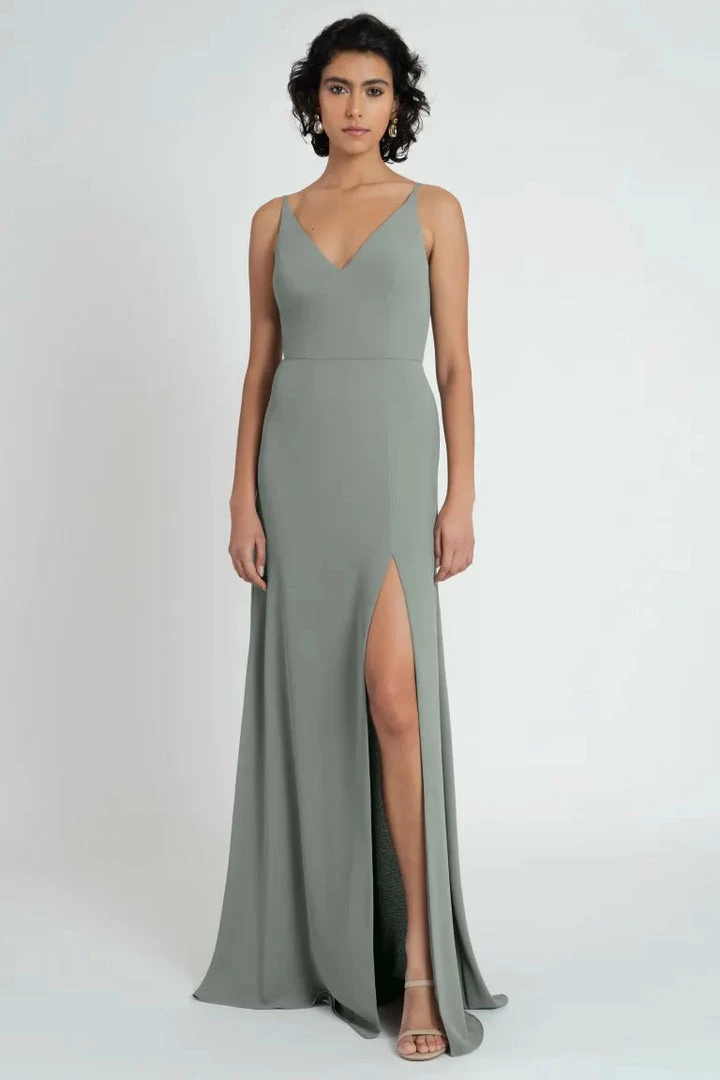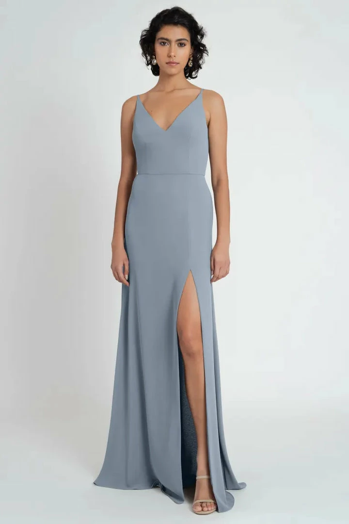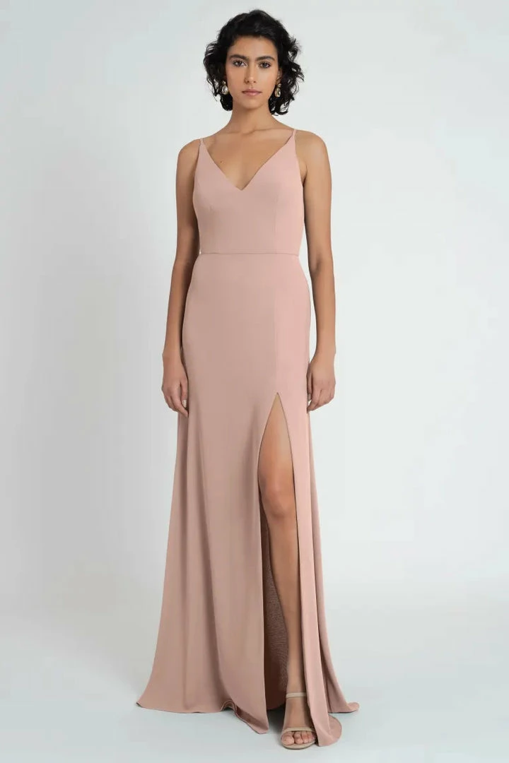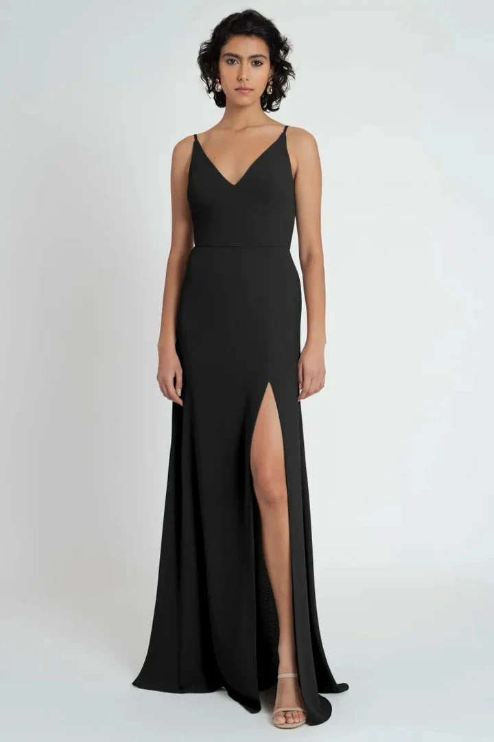 The Nina V neck dress in our new pebbled crepe fabric is an effortlessly chic choice for any occasion. She features an elongating V neck with straps that taper to a spaghetti, and a slim A-line skirt with a flirtatious princess seam slit.