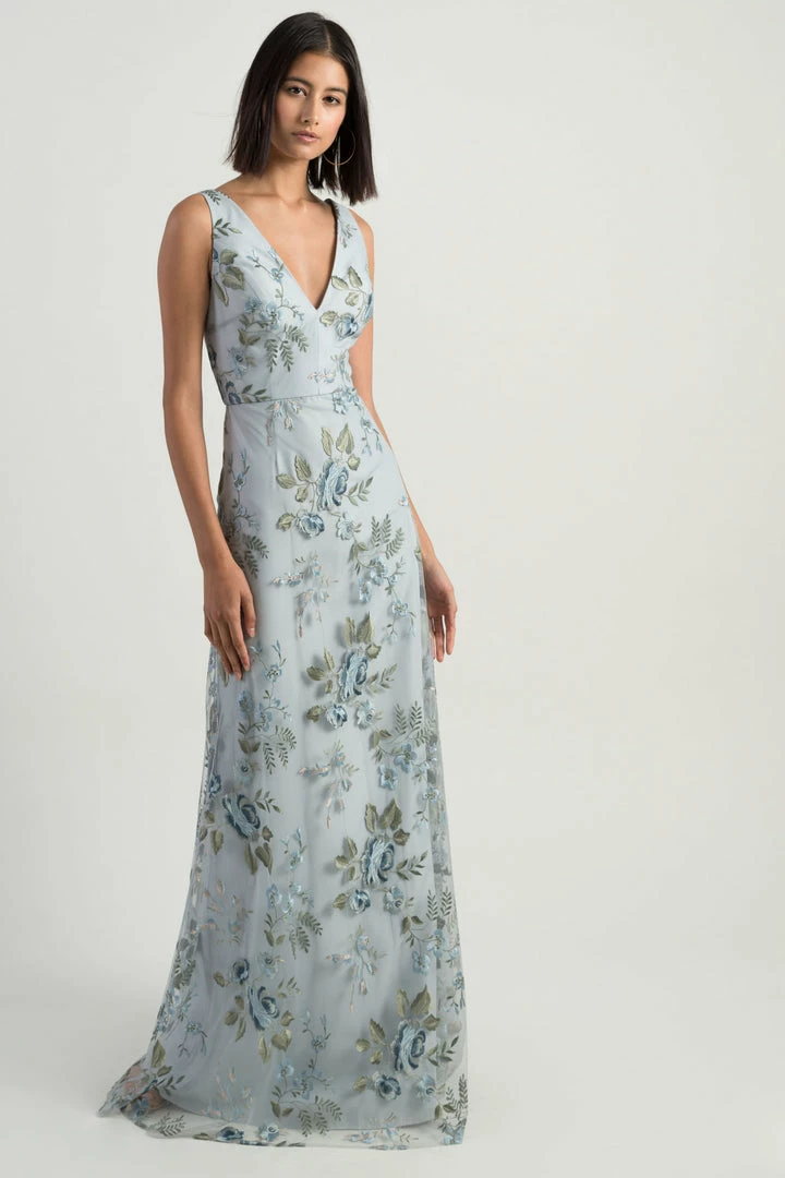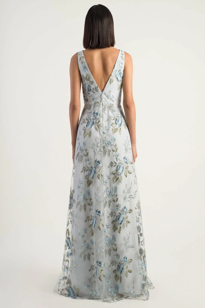 The Tatum dress has a classic A-line silhouette updated with a modern deep V neckline in our unique Enchanted Floral Embroidered Tulle. Bodice princess seams and a defined waist seam provide a close fit, which is complemented by the subtle sweep of the long skirt. This bridesmaid dress is fully lined with a center back invisible zipper.