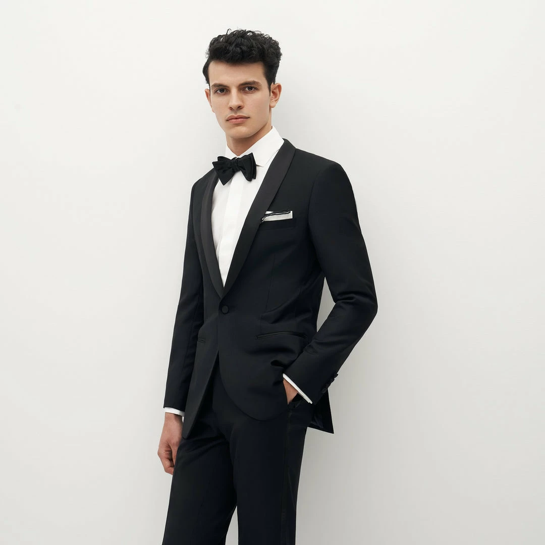 Limited Edition Style: This beautifully tailored Italian made black shawl collar lapel tuxedo jacket is as classic as it gets. A wardrobe essential that you will wear again….and again.