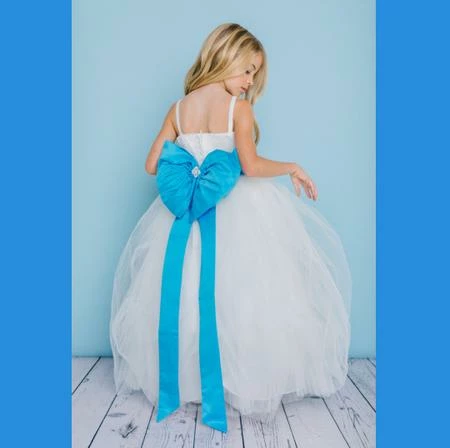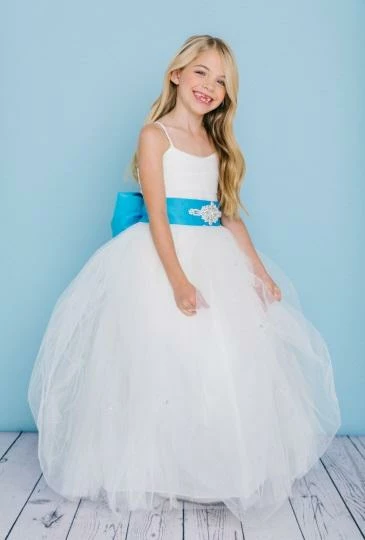 Style 5130 is a full-length dress with a full tulle skirt with pickups accented with rhinestones. The bodice is tulle overlay with spaghetti straps and a V neckline and a V Back. The waist is accented with a 26/30 Bling Sash that ties in the back with a detachable Bling Bow. Satin buttons cover the zipper.