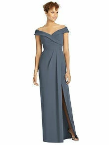 Full length off the shoulder sheer crepe dress with cuffed surplice detail along neckline. Draped faux wrap skirt with side front slit.