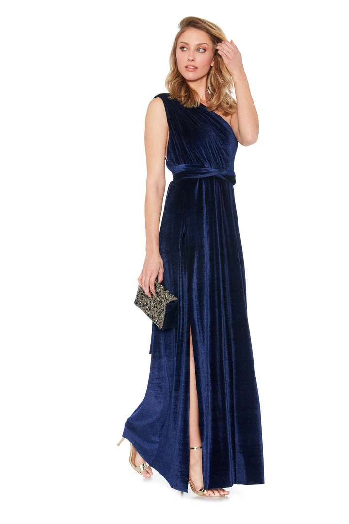 Whether styled as the one shoulder, a cross back, or a halter, the Slit Dress is the perfect gown for all body types and can be worn again and again in an entirely different way.