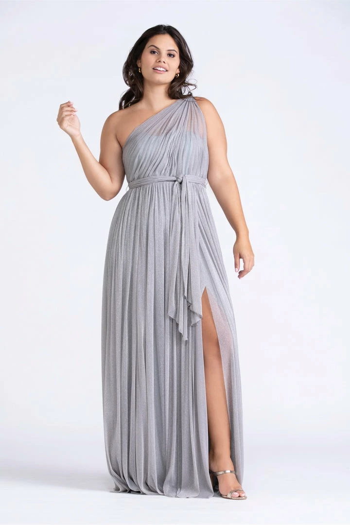 One-shoulder sheath Korby brings the sparkle to the party. Our shimmer mesh is lined in a knit fabric giving the gowns a generous amount of give.