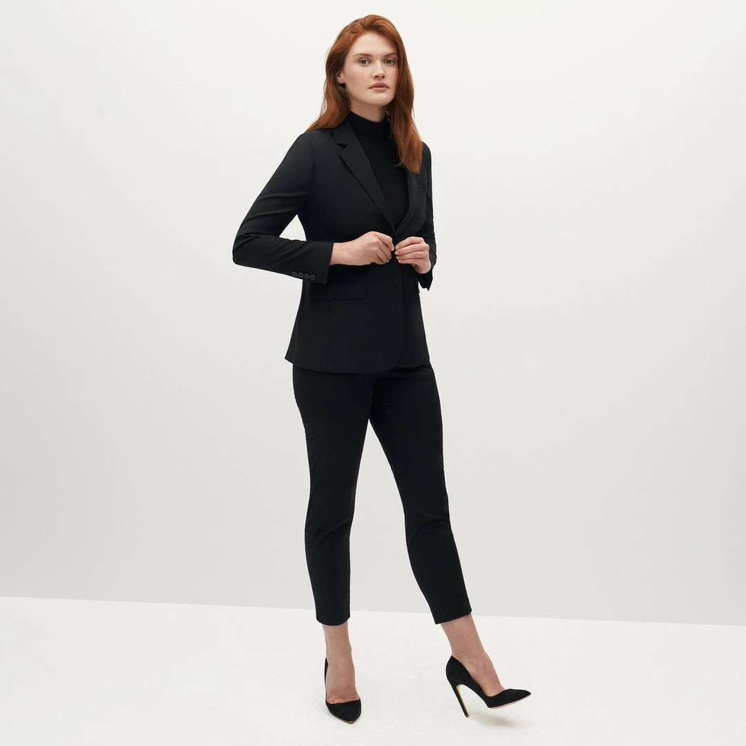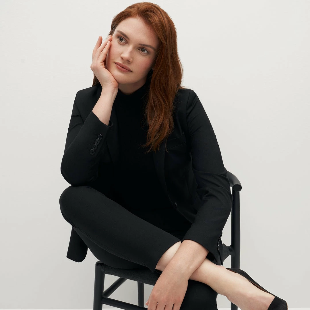 This women’s black suit jacket is as versatile as it is flattering. Designed to follow women’s natural curves, this black blazer never disappoints in photos. You will never want or need to take this jacket off!