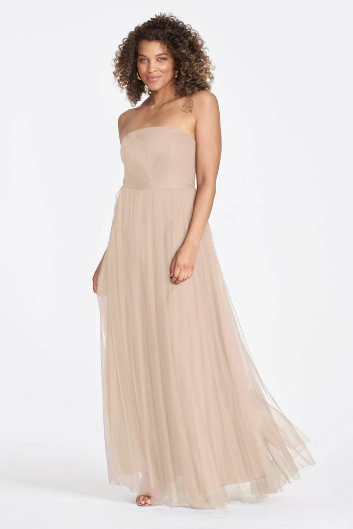 A sunburst of pleated tulle at the bodice puts this strapless number in the spotlight.