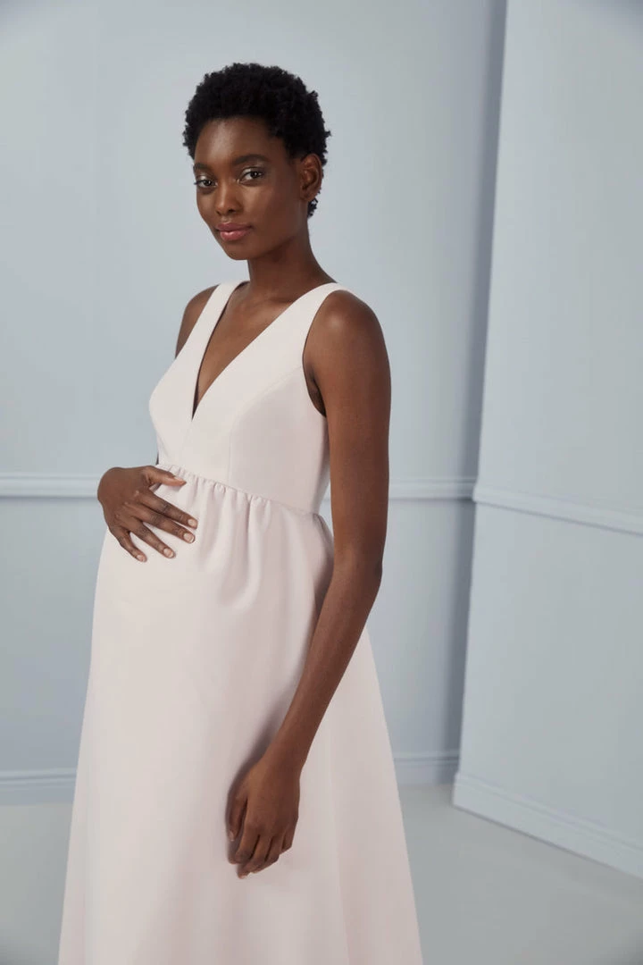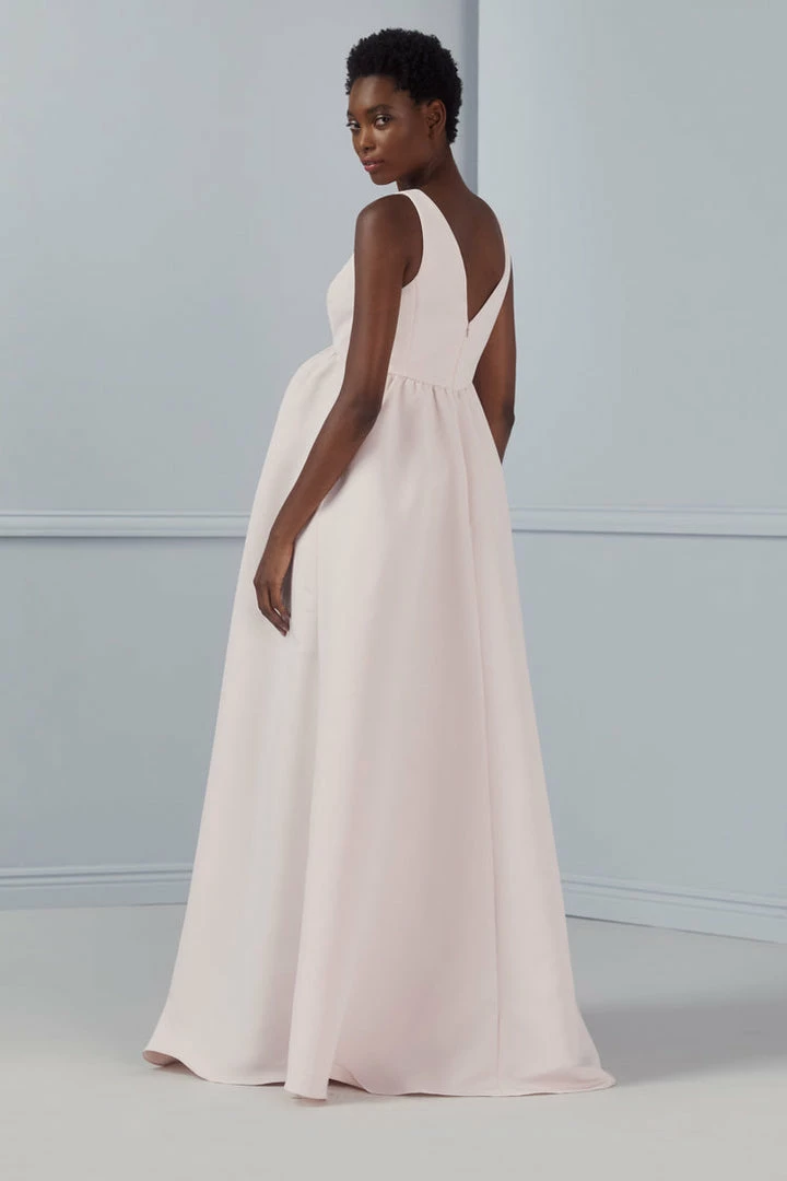 An empire waist leaves room for the baby bump in this charming maternity style rendered in textured faille fabric. The bodice’s front and back feature mirrored V lines.