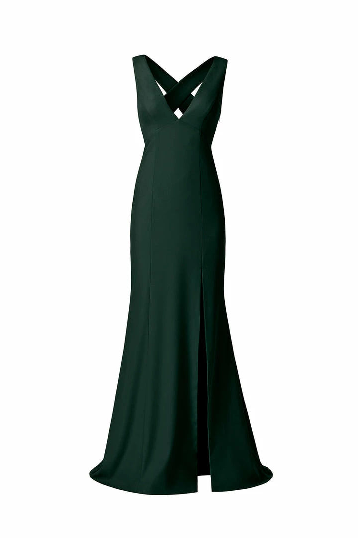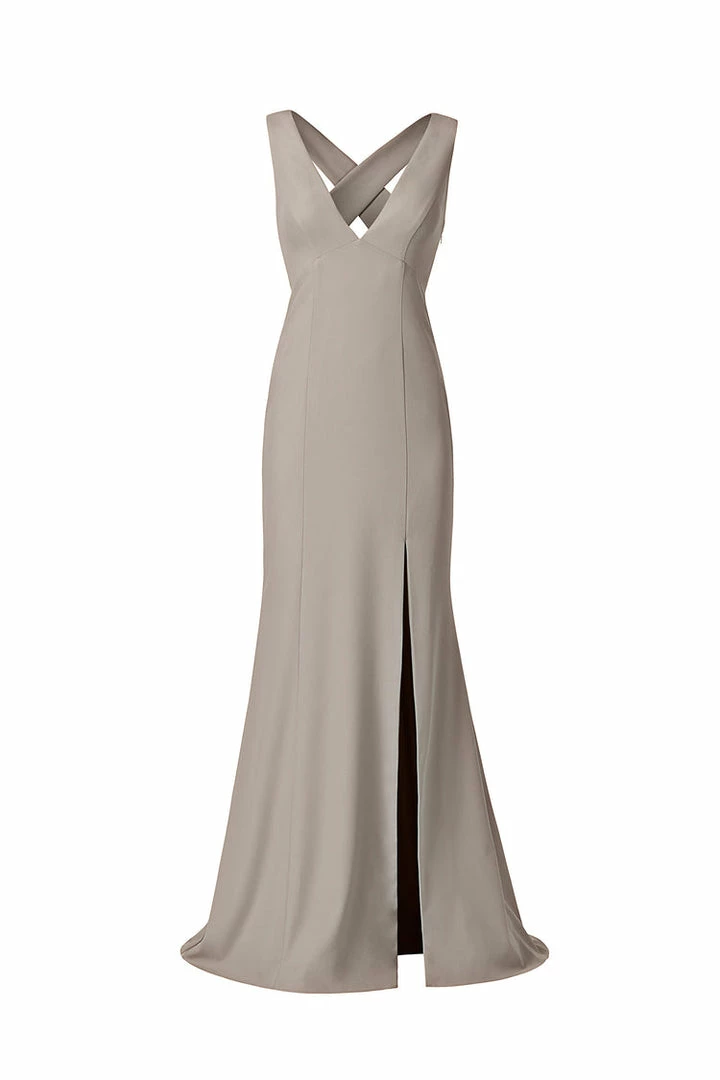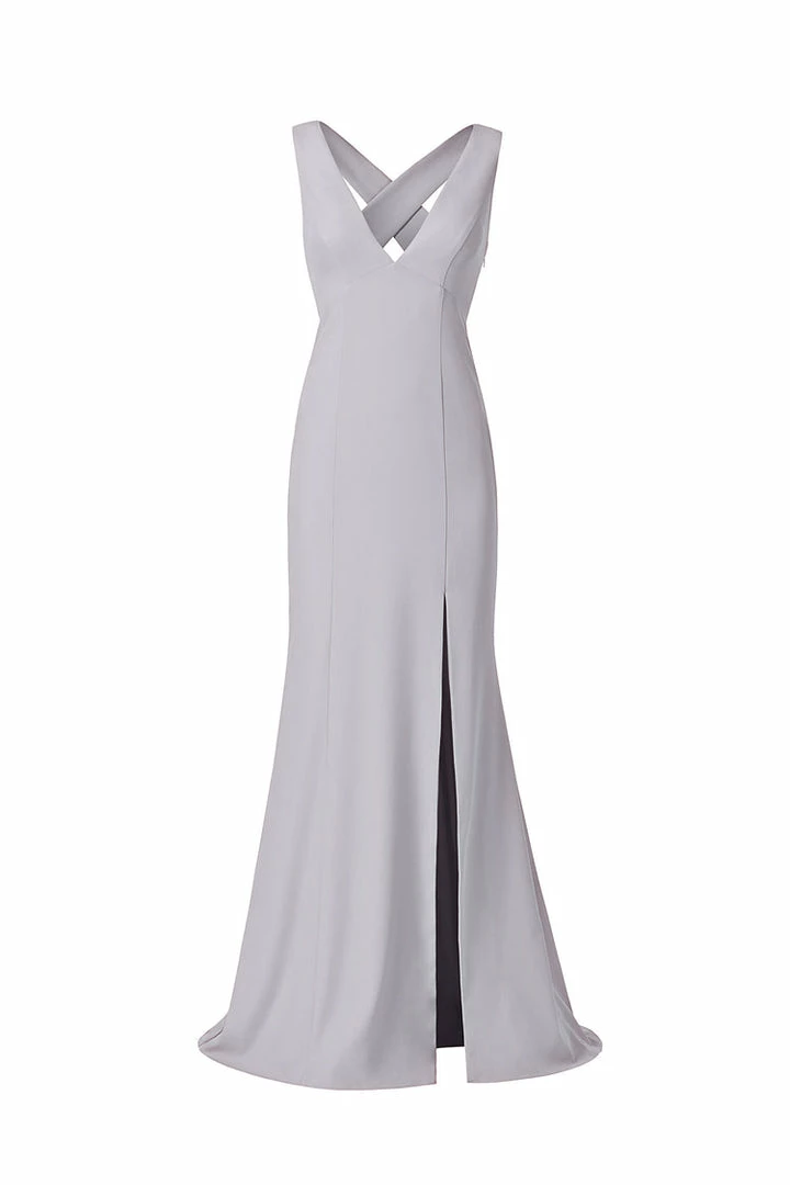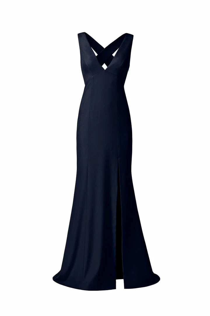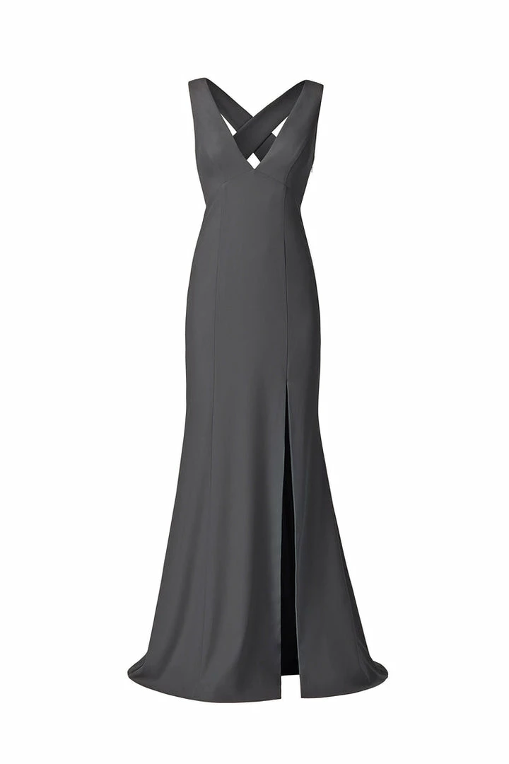 V-neckline with wide cross strap back with slit, fit-to-flare dress in crepe.