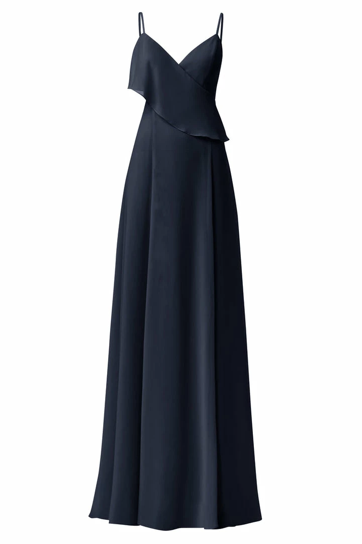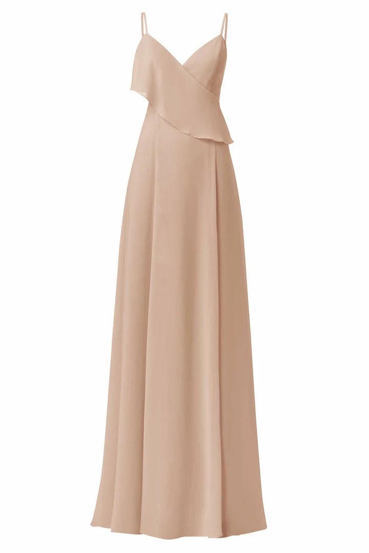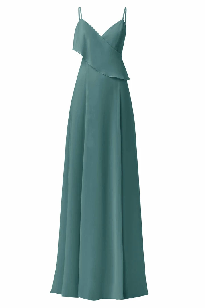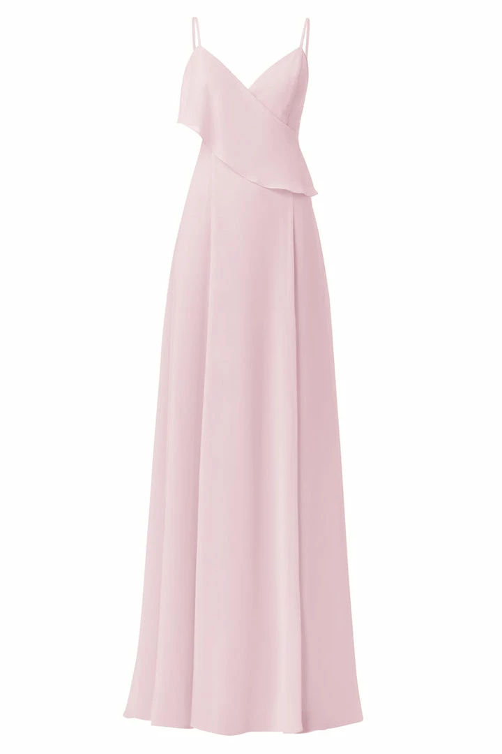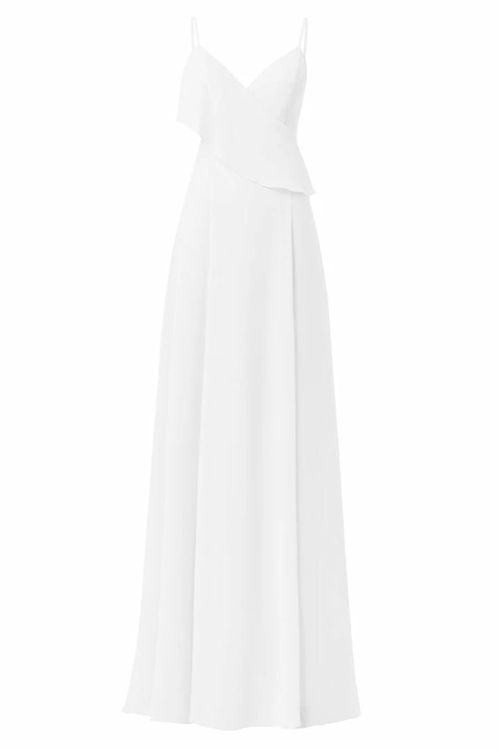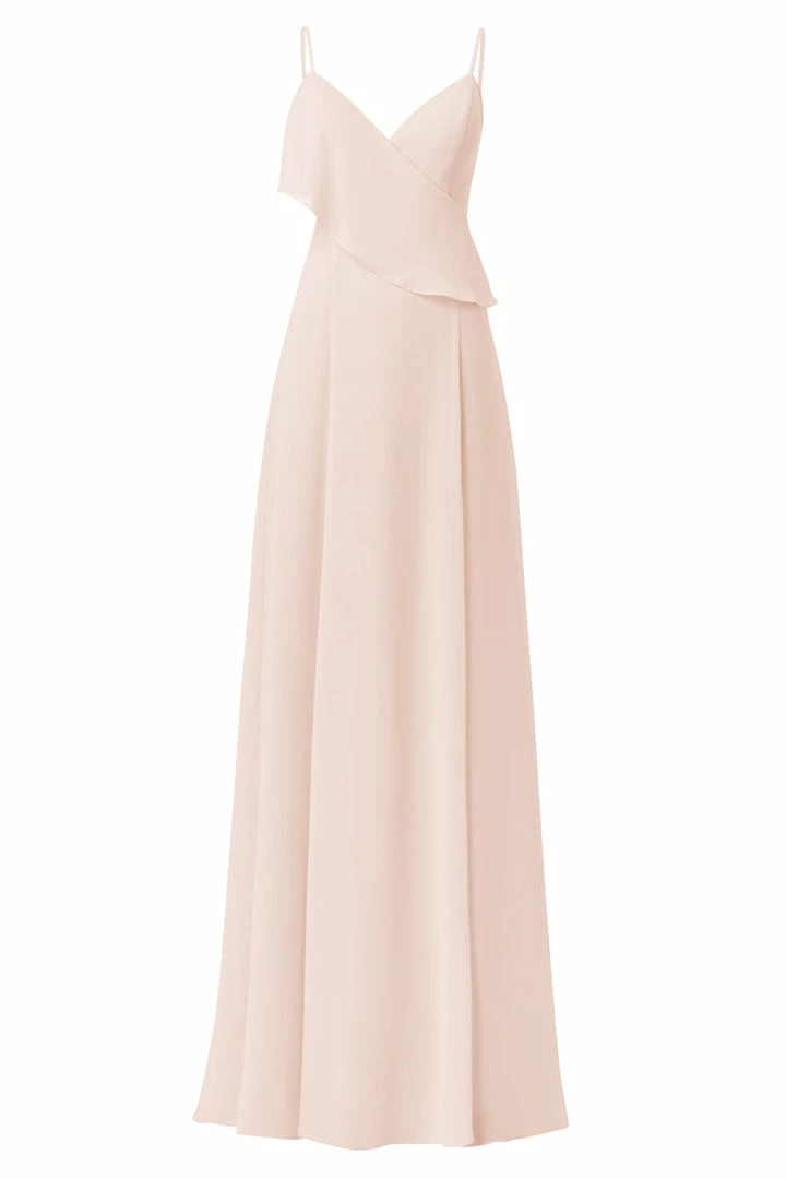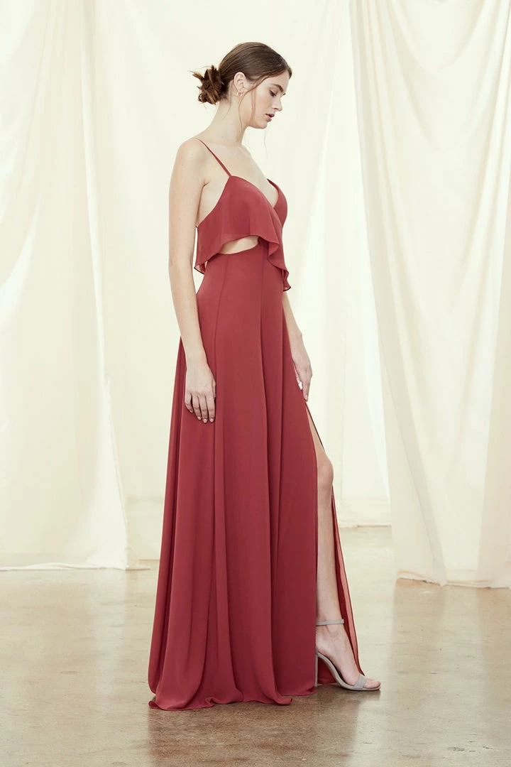 Spaghetti strap bridesmaids dress with asymmetrical ruffle and cutouts. Front slit circle skirt in flat chiffon.