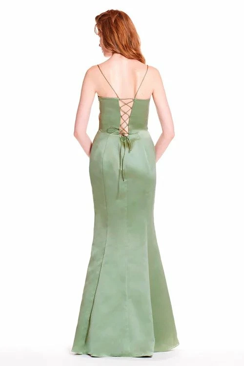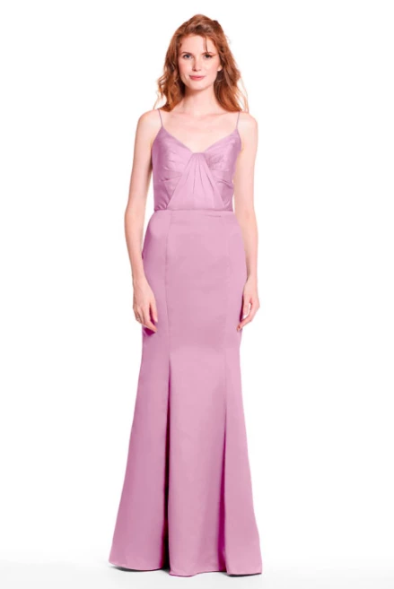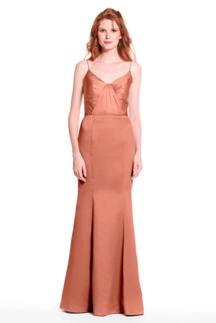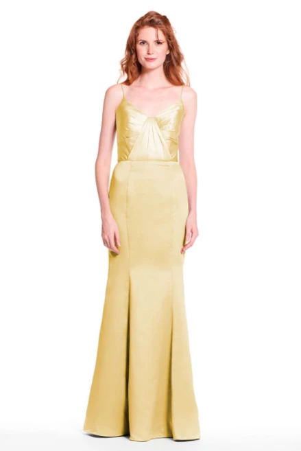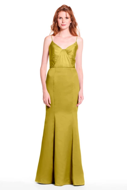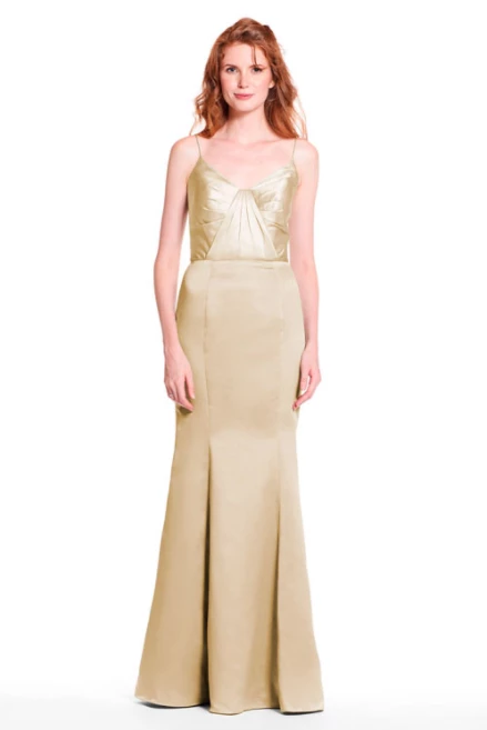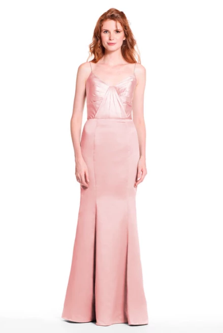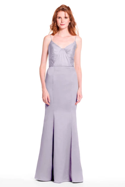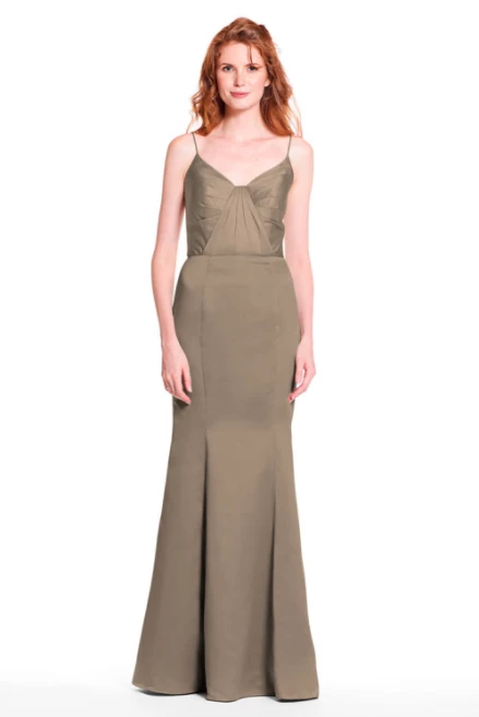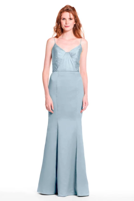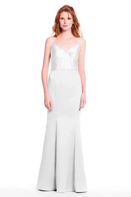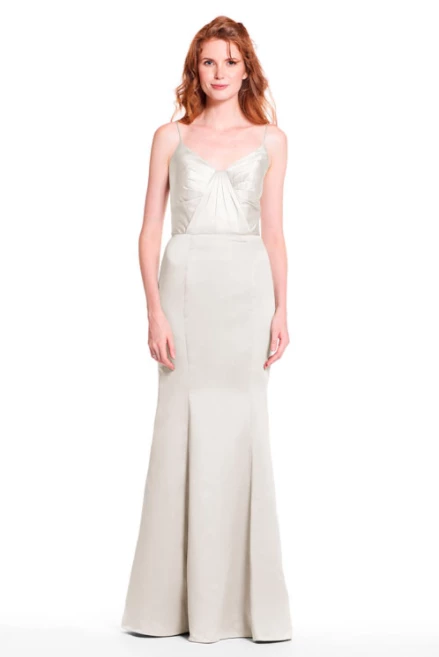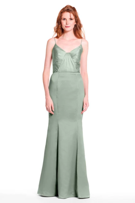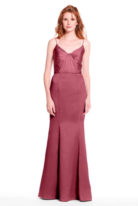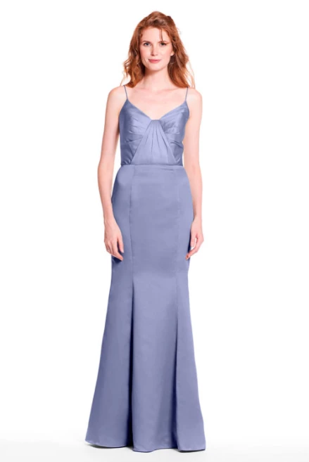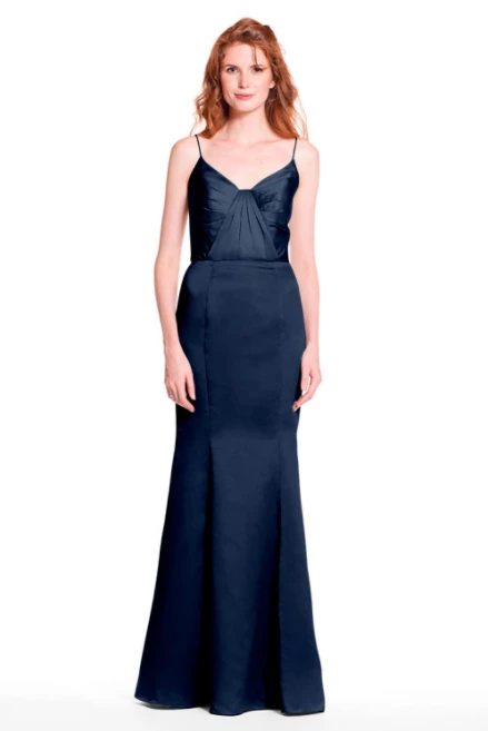 Bari Jay Bridesmaid Dress J-1942 –Â Draped neckline bodice with center front pleats and fitted trumpet skirt.