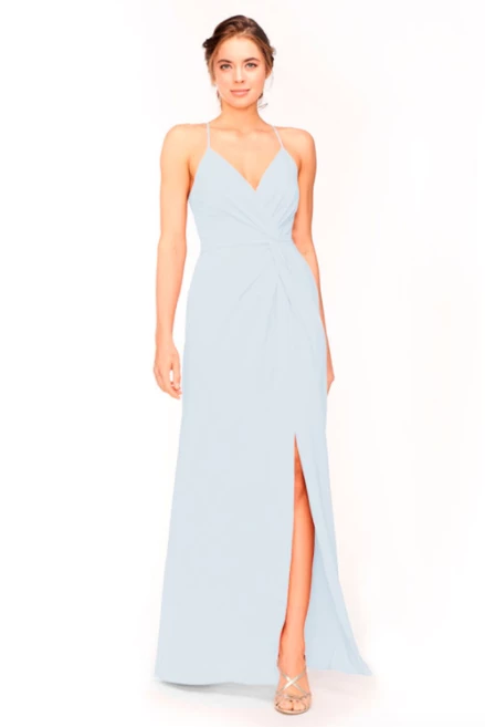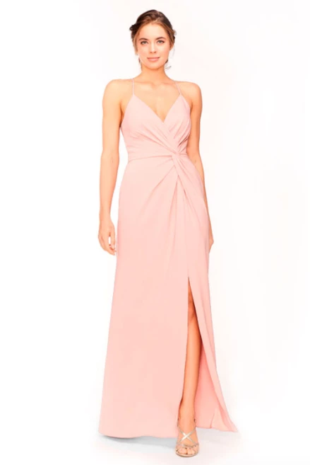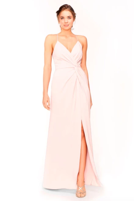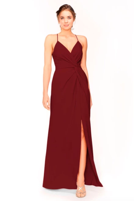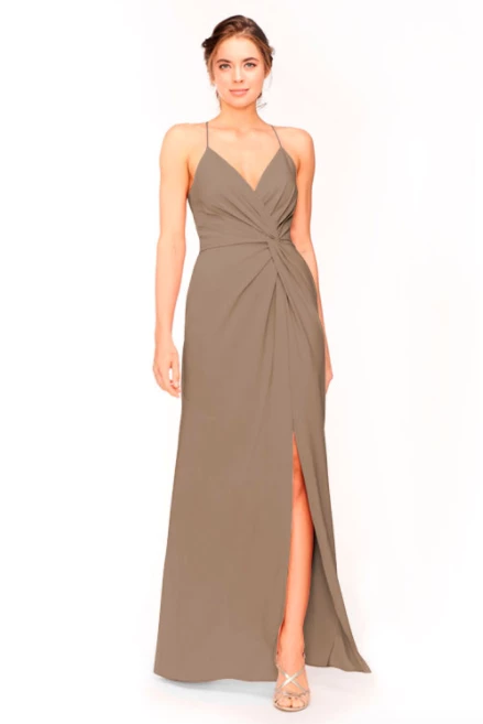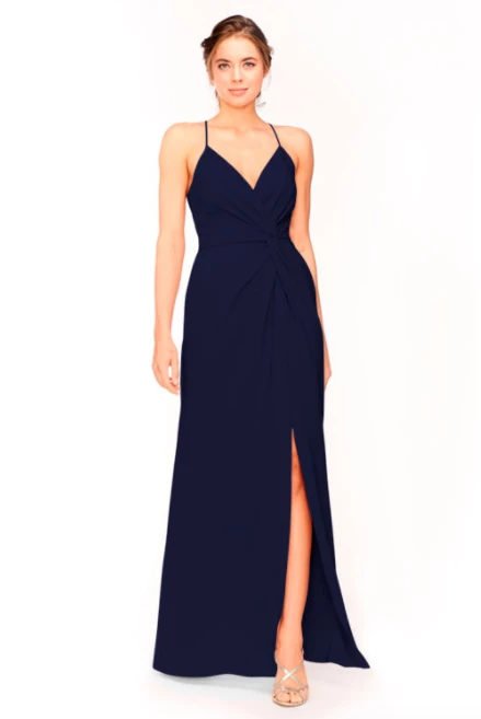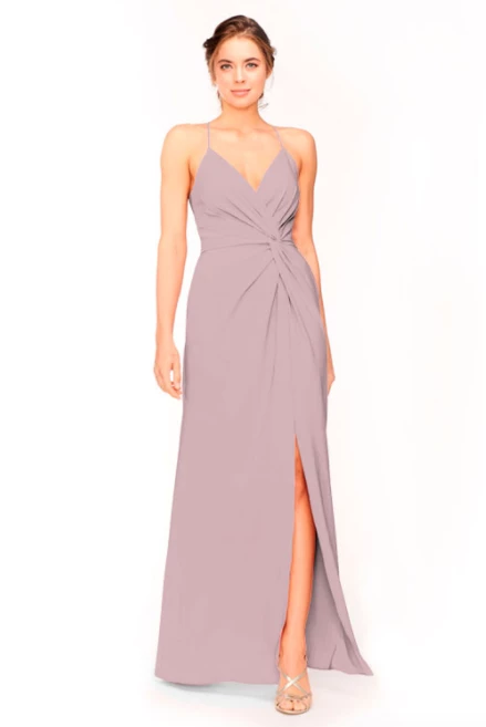 Bari Jay Bridesmaid Dress 1951Â – V-neck asymmetrical pleated twist bodice & skirt with slit.