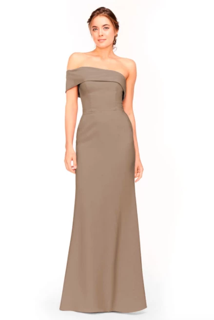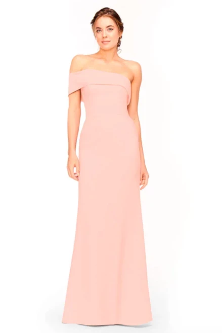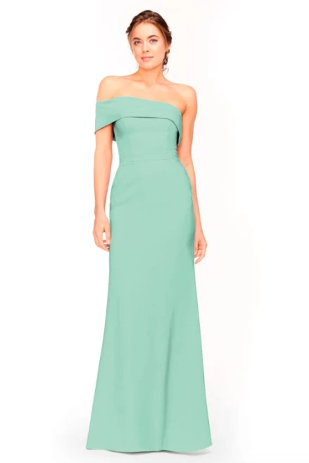Bari Jay Bridesmaid Dress 1957Â – Asymmetrical off the shoulder gown with a slim fit skirt.