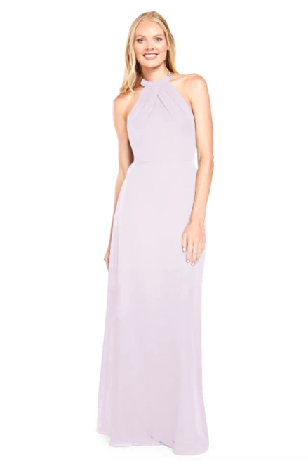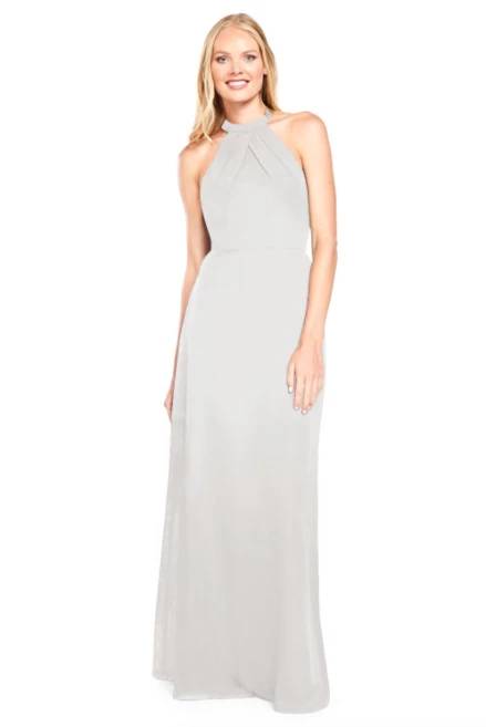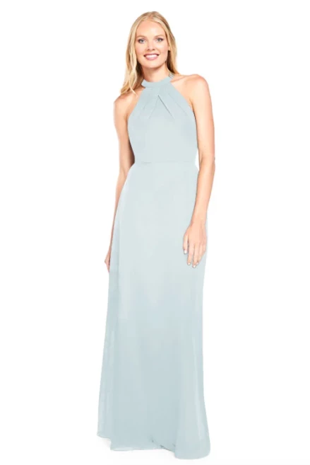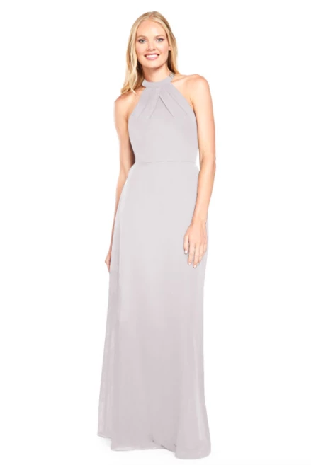 Pleated halter bodice with A-line skirt and sheer chiffon back panels on the back.