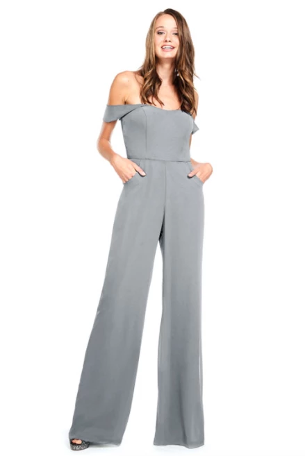 Off the shoulder drapes on a sweetheart bodice jumpsuit with pockets.