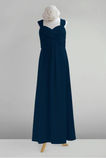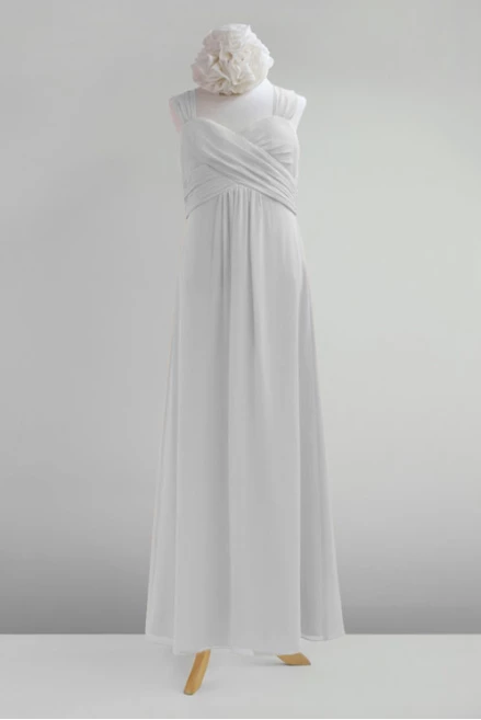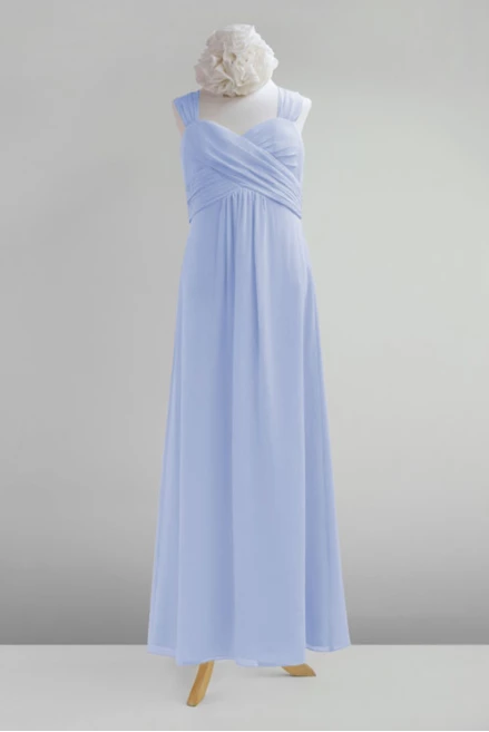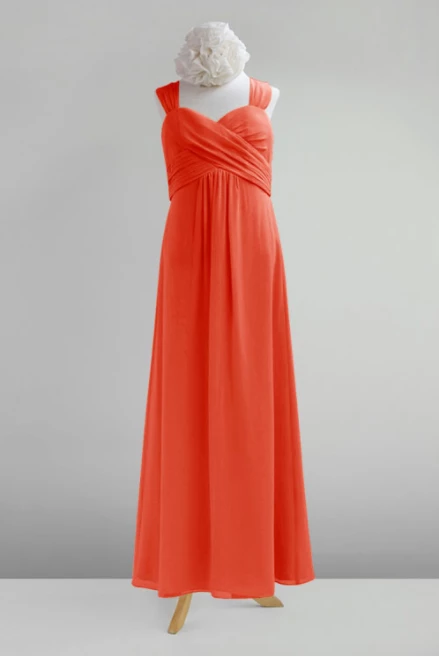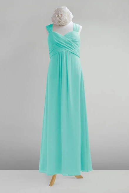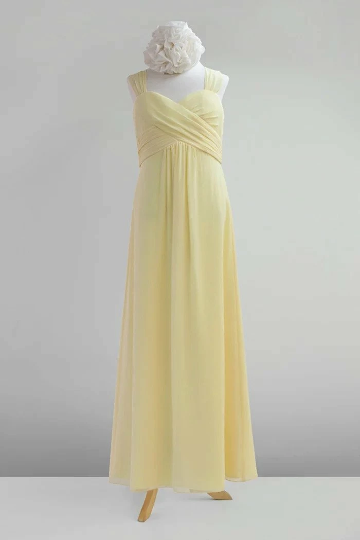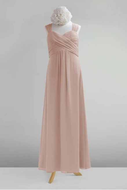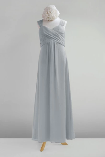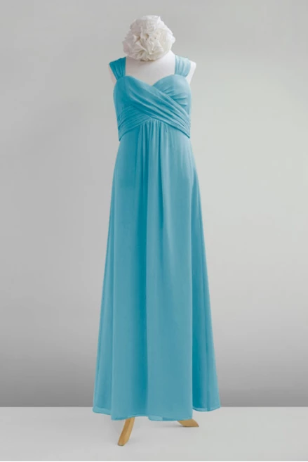 Sweetheart shirred bust; empire waist, sheer criss-cross back.
