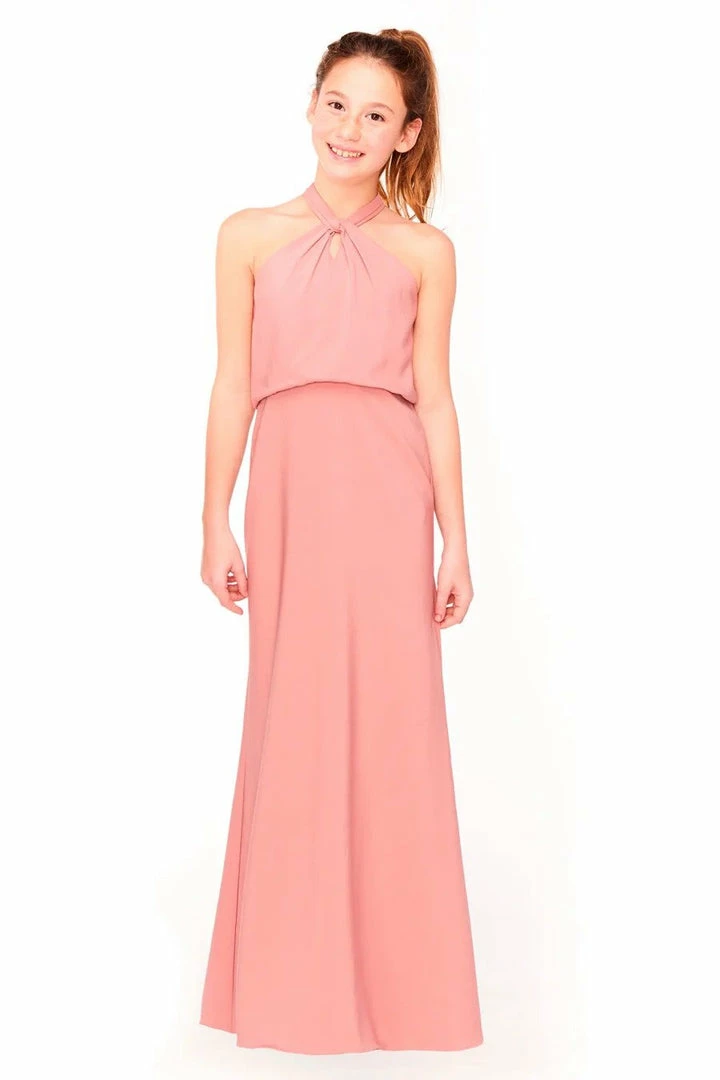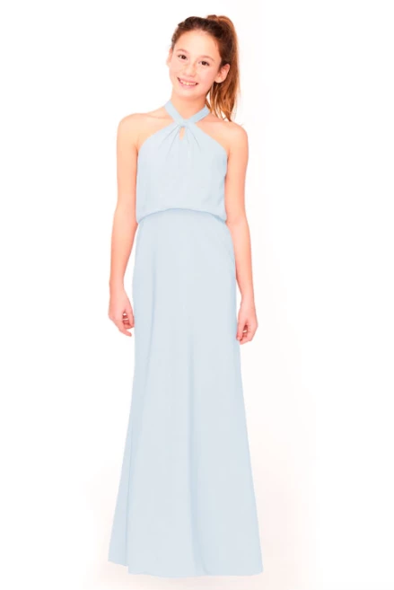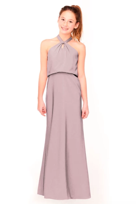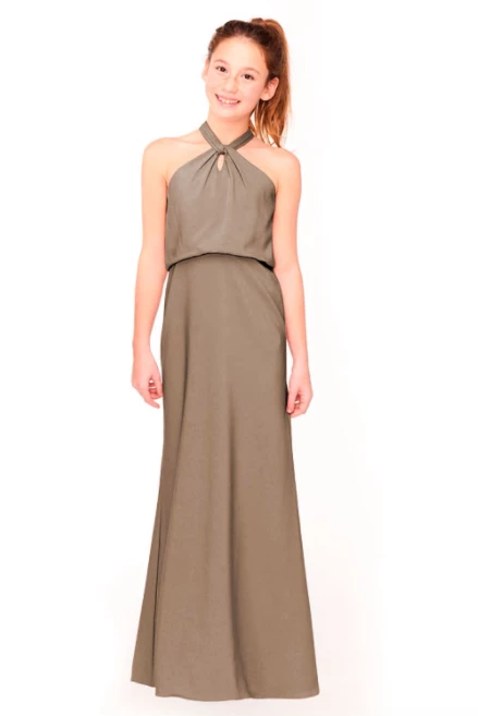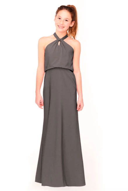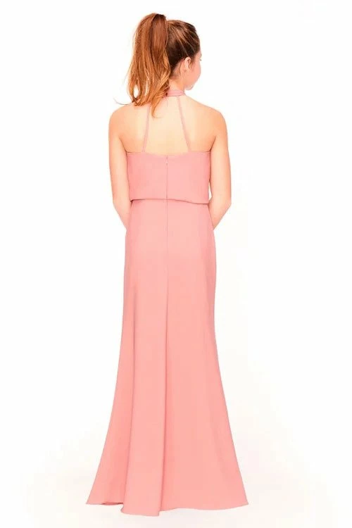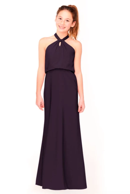 Pleated keyhole halter blouson bodice with a straight skirt.