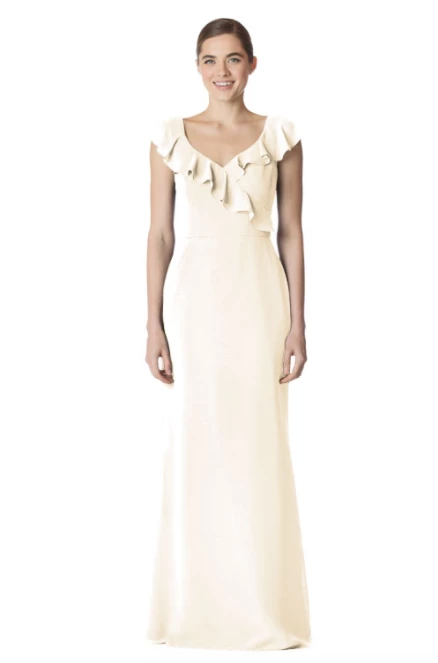V-neck bodice with a ruffle that creates slight flutter sleeve and deep V-back. Short length: 35 inches. (Short style photo not available)