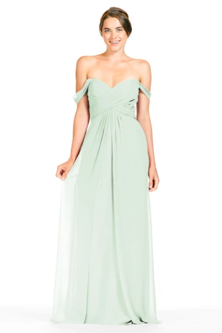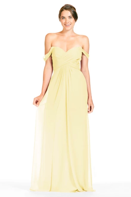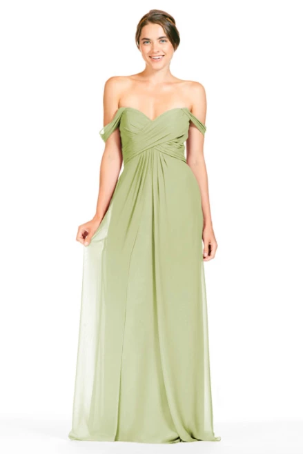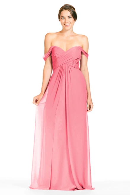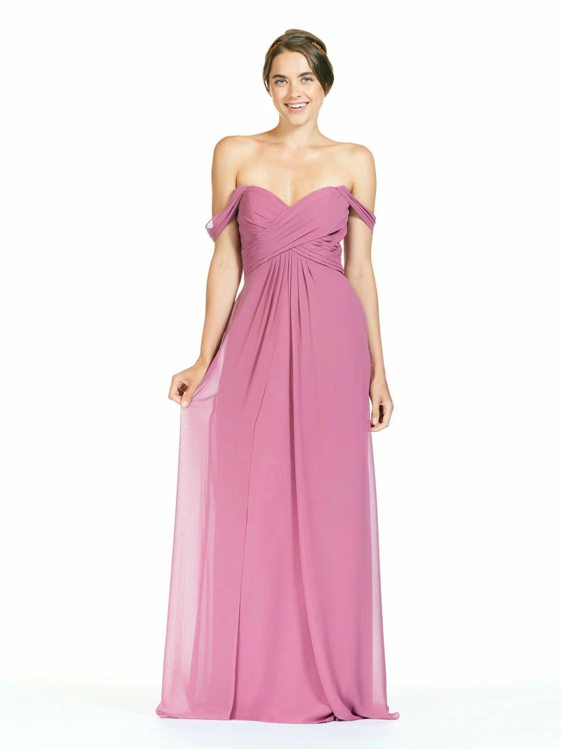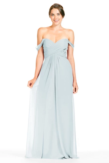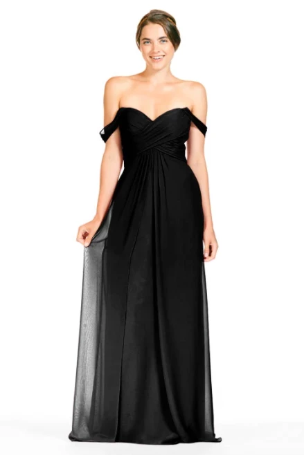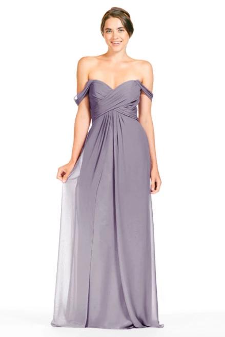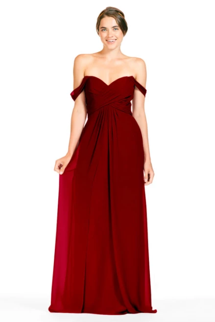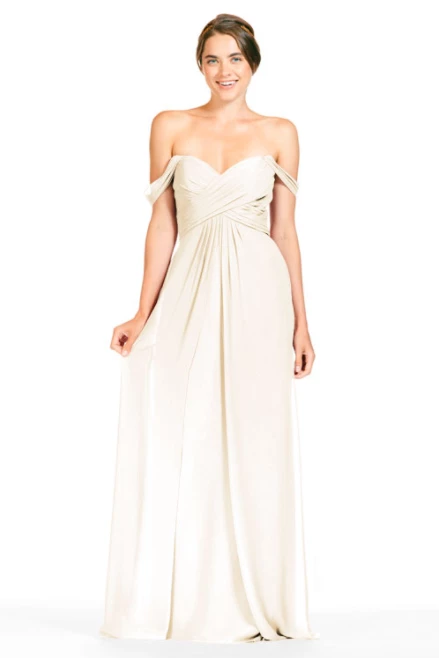 Sweetheart bodice with off-the-shoulder drapes. Split skirt with Pockets. Short length: 35 inches. (Short style photo not available).